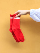 Trendige Socken mit sportlichen Streifen und femininem, gewelltem Rand am oberen Ende. Die weiche und elastische Qualität sorgt für ein angenehmes Tragegefühl, während die gerippten Details für einen coolen und entspannten Look sorgen.
