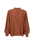 Schönes, lockeres Hemd in weicher und leicht strukturierter Qualität. Das Design hat einen klassischen Stehkragen, eine durchgehende Knopfleiste und lange Ballonärmel mit Manschetten. Das Modell ist geräumig und hat eine entspannte, übergroße Passform – perfekt für einen lässigen, aber eleganten Look.
