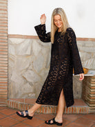 Unser Helena Kleid ist ein wunderschönes Kleid mit Lochstickerei, langen Raglanärmeln und einem Bindeband am Ausschnitt. Das Kleid hat einen schönen Schlitz vorne und eine lockere, luftige Passform. Perfekt für heiße Sommertage oder als Strandüberwurf.