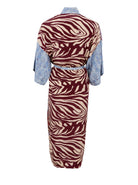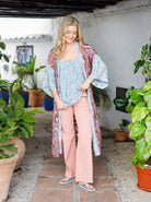 Unser langer Luna Kimono ist die perfekte Kombination aus Eleganz und Komfort. Mit seinem farbenfrohen Muster und dem entspannten Schnitt sorgt er für einen stilvollen und luxuriösen Look. Der Kimono hat weite, kurze Ärmel, praktische Seitentaschen und einen passenden Gürtel, mit dem Sie die Passform anpassen können.