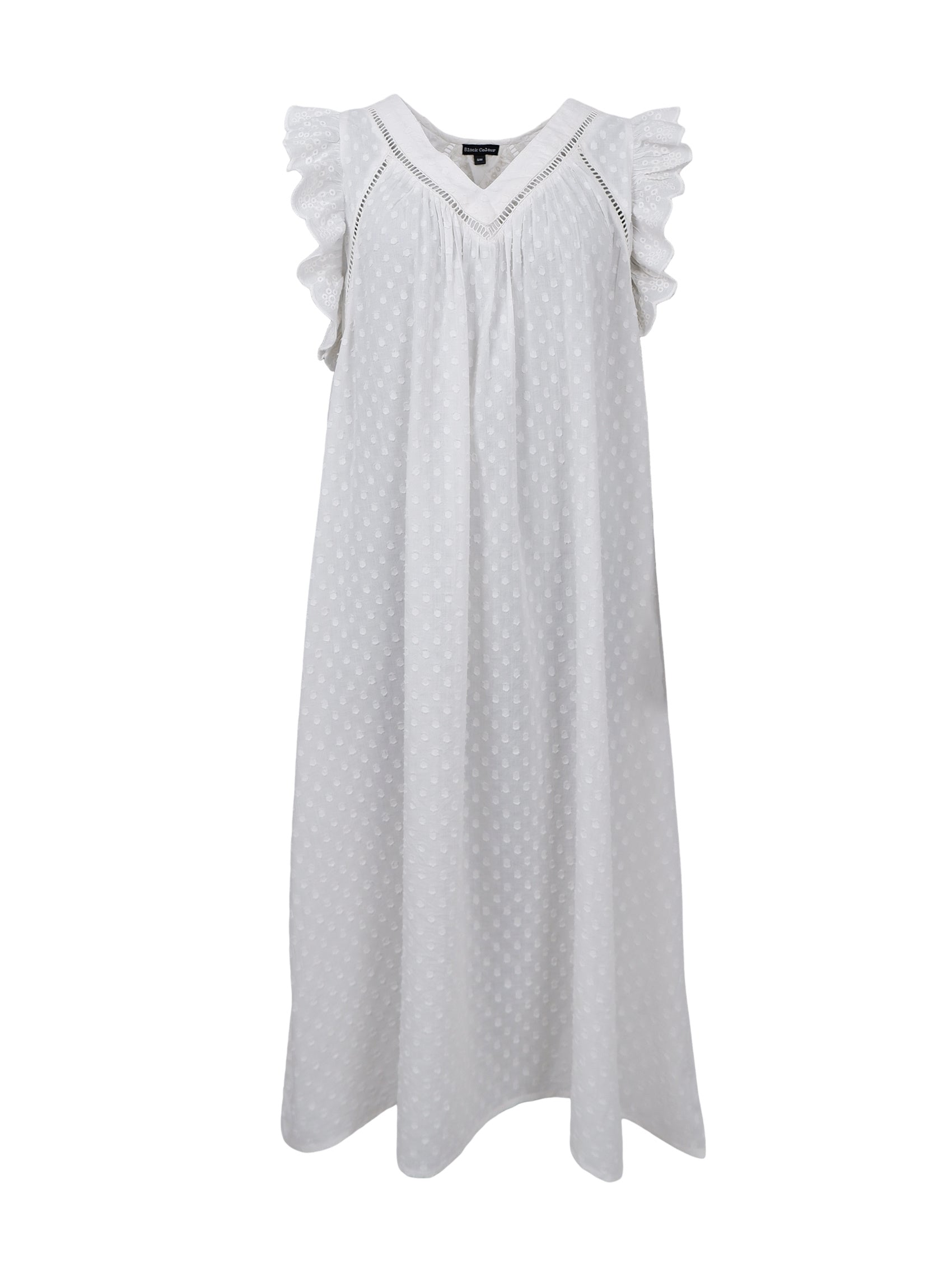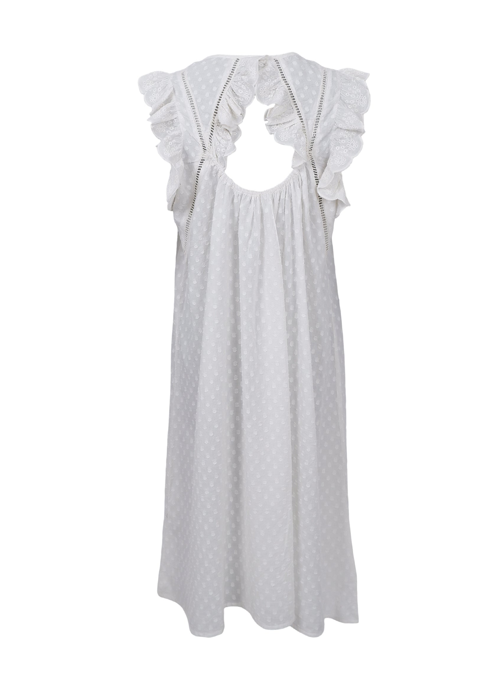 Das Mie-Kleid ist ein langes, ärmelloses Kleid mit V-Ausschnitt und femininen Rüschendetails am Armausschnitt. Das Modell hat einen schönen Ausschnitt im Rücken, der für einen leichten und luftigen Look sorgt. Perfekt für warme Sommertage oder festliche Anlässe.