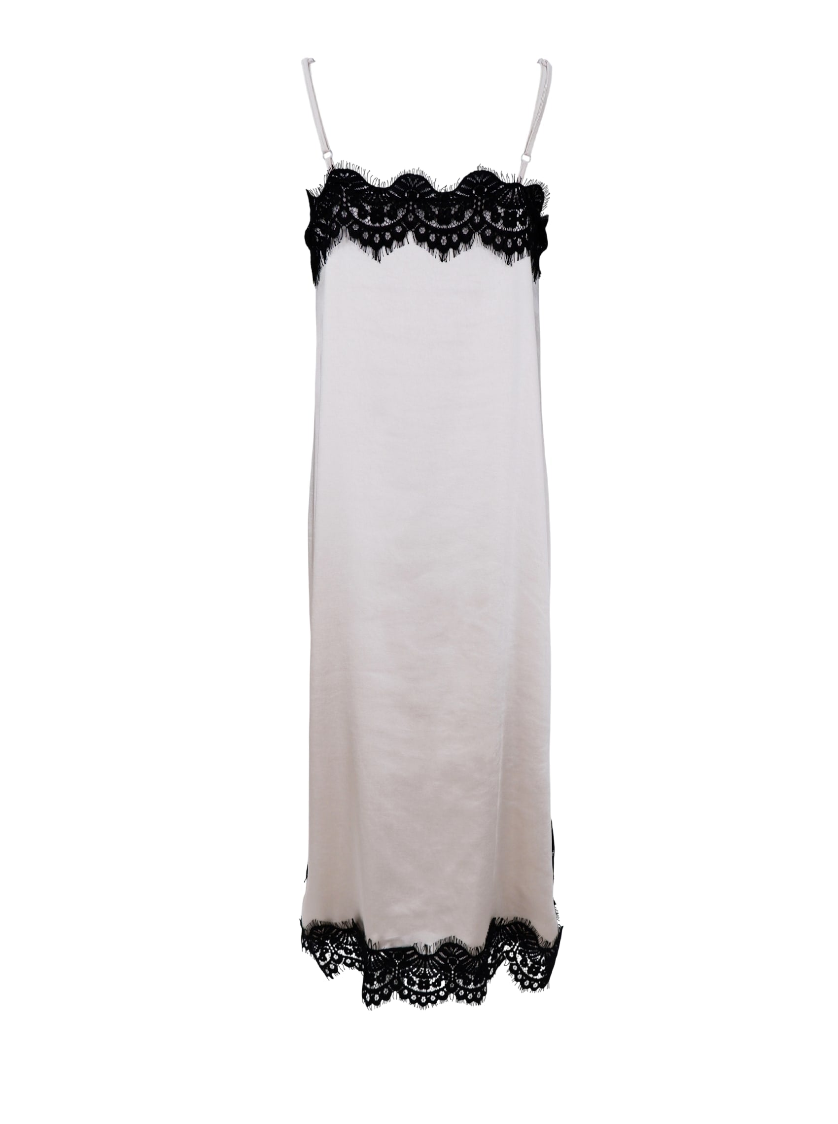 Elegantes Kleid mit dünnen Trägern und wunderschönen Spitzenborten an Ober- und Unterteil. Das Kleid hat eine schöne, gerade Passform, fällt fließend und verleiht einen eleganten Look. Der weiche, leicht glänzende Stoff sorgt für einen exklusiven Touch und macht das Kleid perfekt für festliche Anlässe und den Abend.
