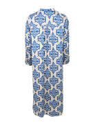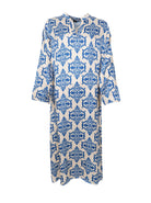Langes bedrucktes Kleid aus Satin. Maße S/M: ½ Brustumfang: 53 cm. Länge: 125 cm.