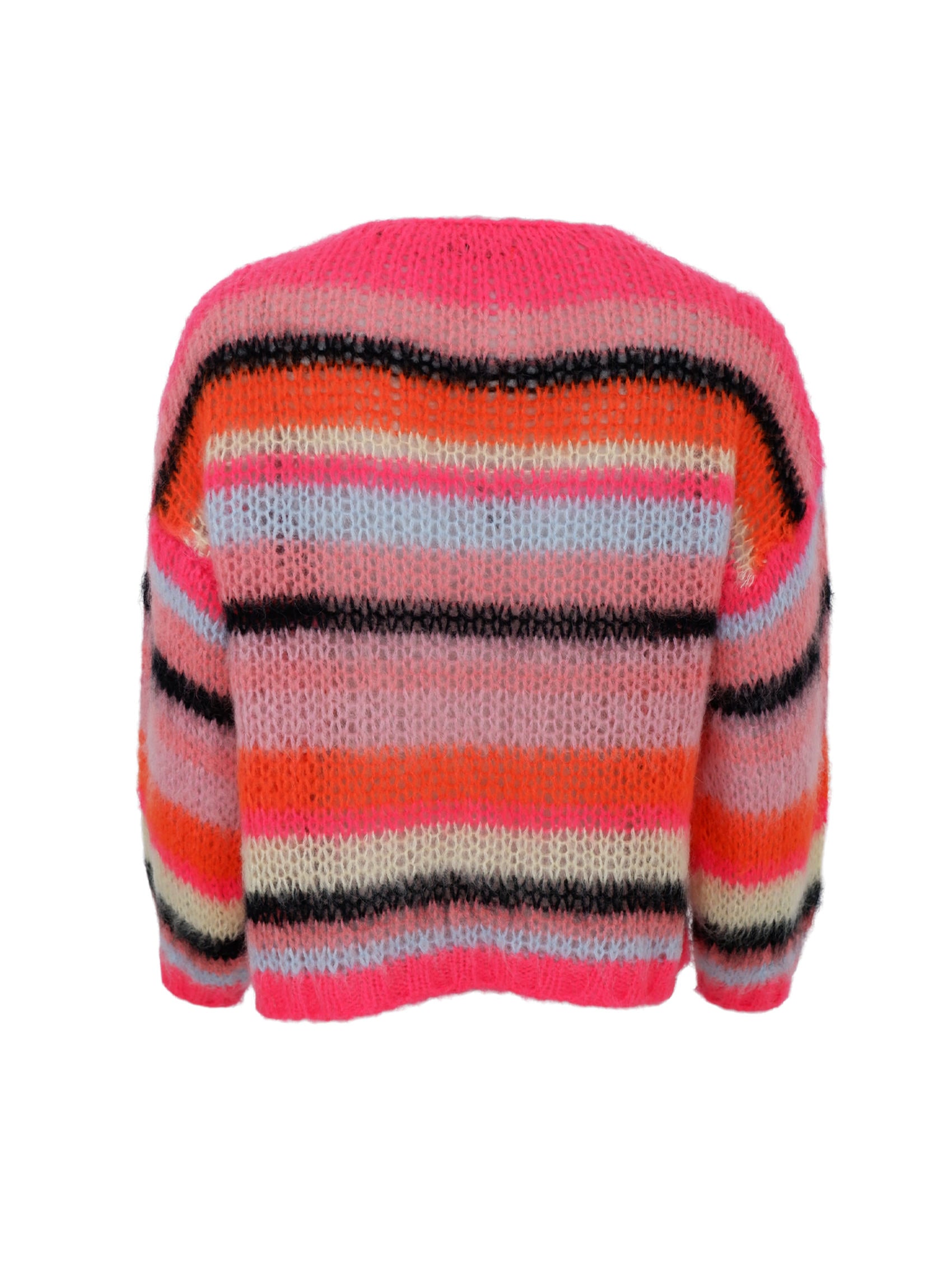 Die mehrfarbig gestreifte Strickjacke Adelin besteht zu 30 % aus Mohairwolle und wärmt Sie daher an einem kühlen Tag mit Sicherheit.