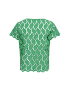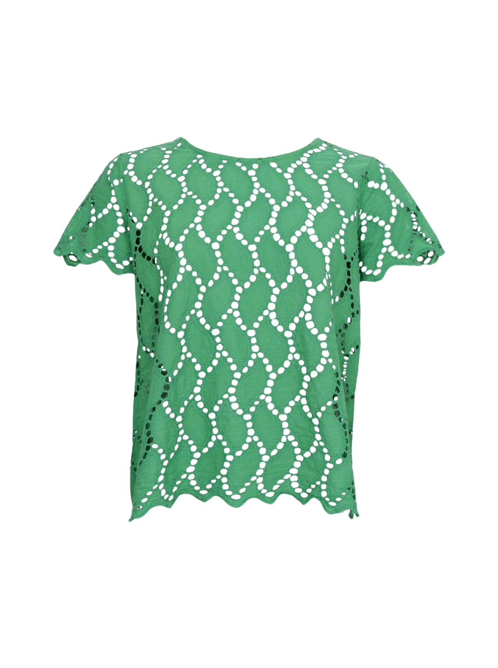 Die Bluse Freya ist eine elegante Kurzarmbluse mit Rundhalsausschnitt. Sie besteht aus einem wunderschön bestickten Stoff mit feinen Ausschnitten, die ihr einen femininen und luftigen Ausdruck verleihen. Die Bluse hat einen gewellten Saum an Ärmeln und Saum, der ihr einen leichten und sommerlichen Look verleiht.