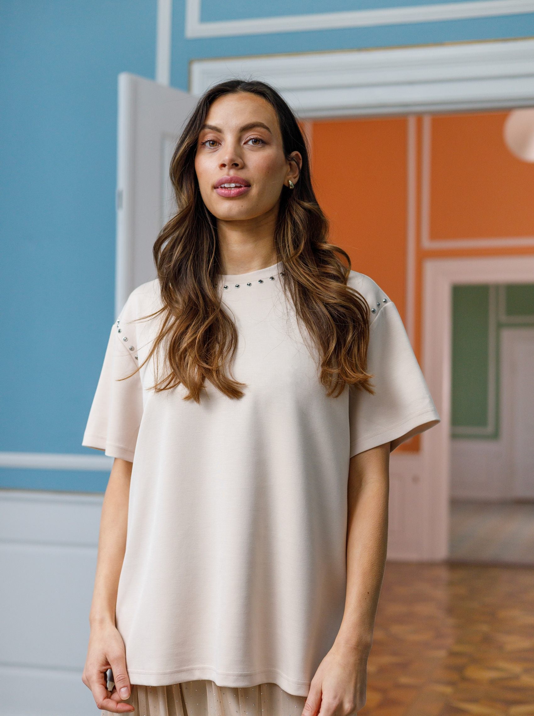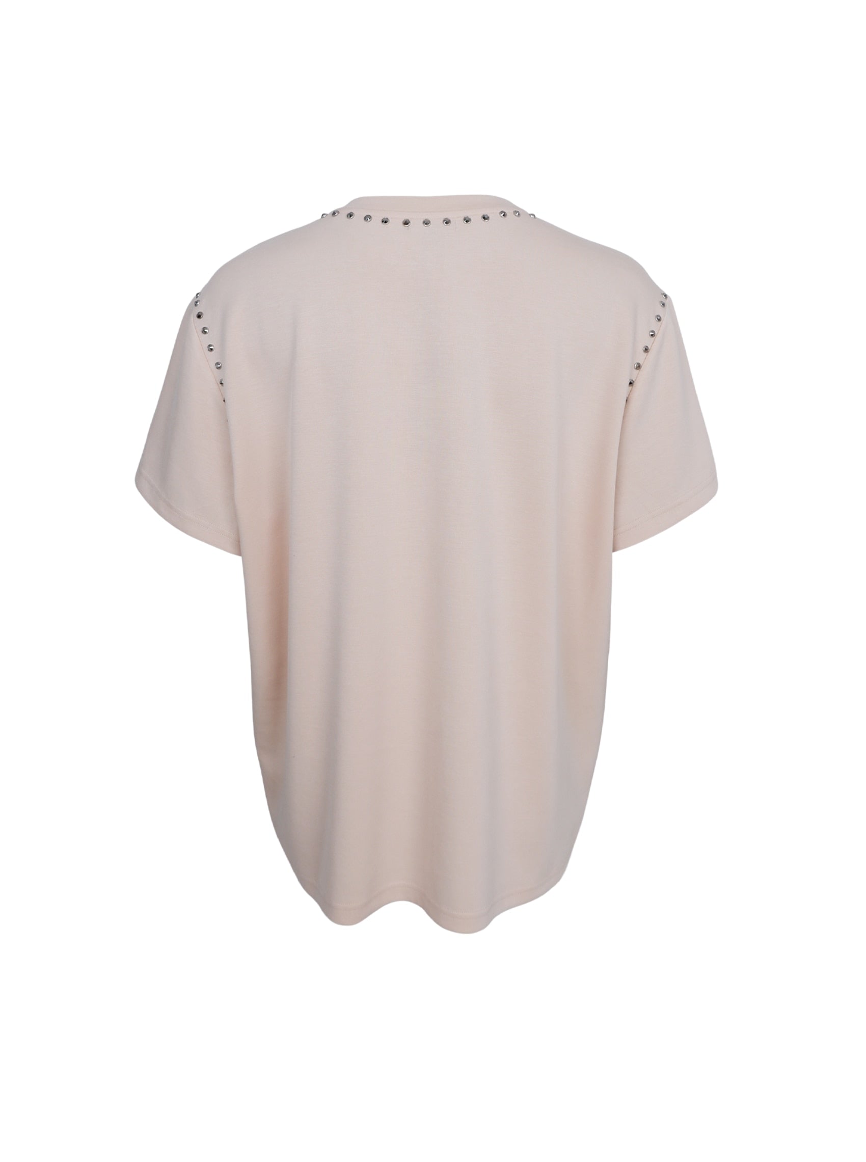 Unser Joni T-Shirt ist eine kurzärmelige und lässige Oversize-Bluse. Das T-Shirt hat coole Ziernägel entlang der Nähte am Hals und am Armausschnitt, die ihm einen coolen und lässigen Look verleihen. Das Joni T-Shirt besteht aus einer weichen Viskosemischung und ist daher genau die Bluse, die Sie in Ihrem Kleiderschrank suchen. Tragen Sie diese Bluse zu einer coolen Jeans oder einem stylischen Rock.