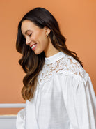 Die wunderschöne Bluse Leona ist aus einer weichen und leichten Viskosemischung gefertigt und besticht durch feinste Details. Die Bluse hat oben Spitze und einen hohen Kragen, was ihr einen schönen und femininen Look verleiht. Die Bluse lässt sich leicht an- und ausziehen und hat am Hals eine hübsche kleine Öffnung mit Knöpfen.