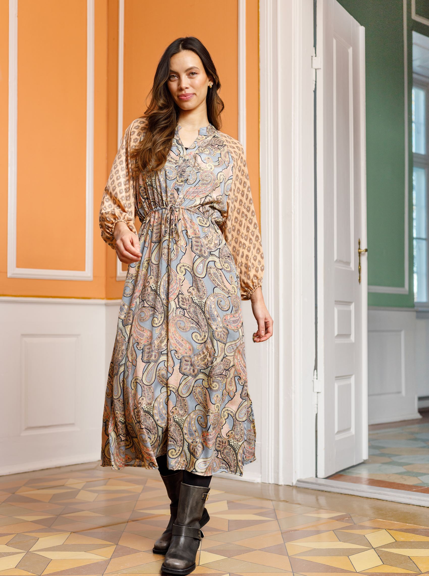 Dieses wunderschöne lange Kleid ist die perfekte Ergänzung für Ihre Garderobe. Es hat schöne, weite Ärmel und einen Bindegürtel in der Taille, der für eine schöne Silhouette und eine verstellbare Passform sorgt. Das Kleid ist in wunderschönen und einzigartigen Prints erhältlich, die Ihre Weiblichkeit perfekt betonen.