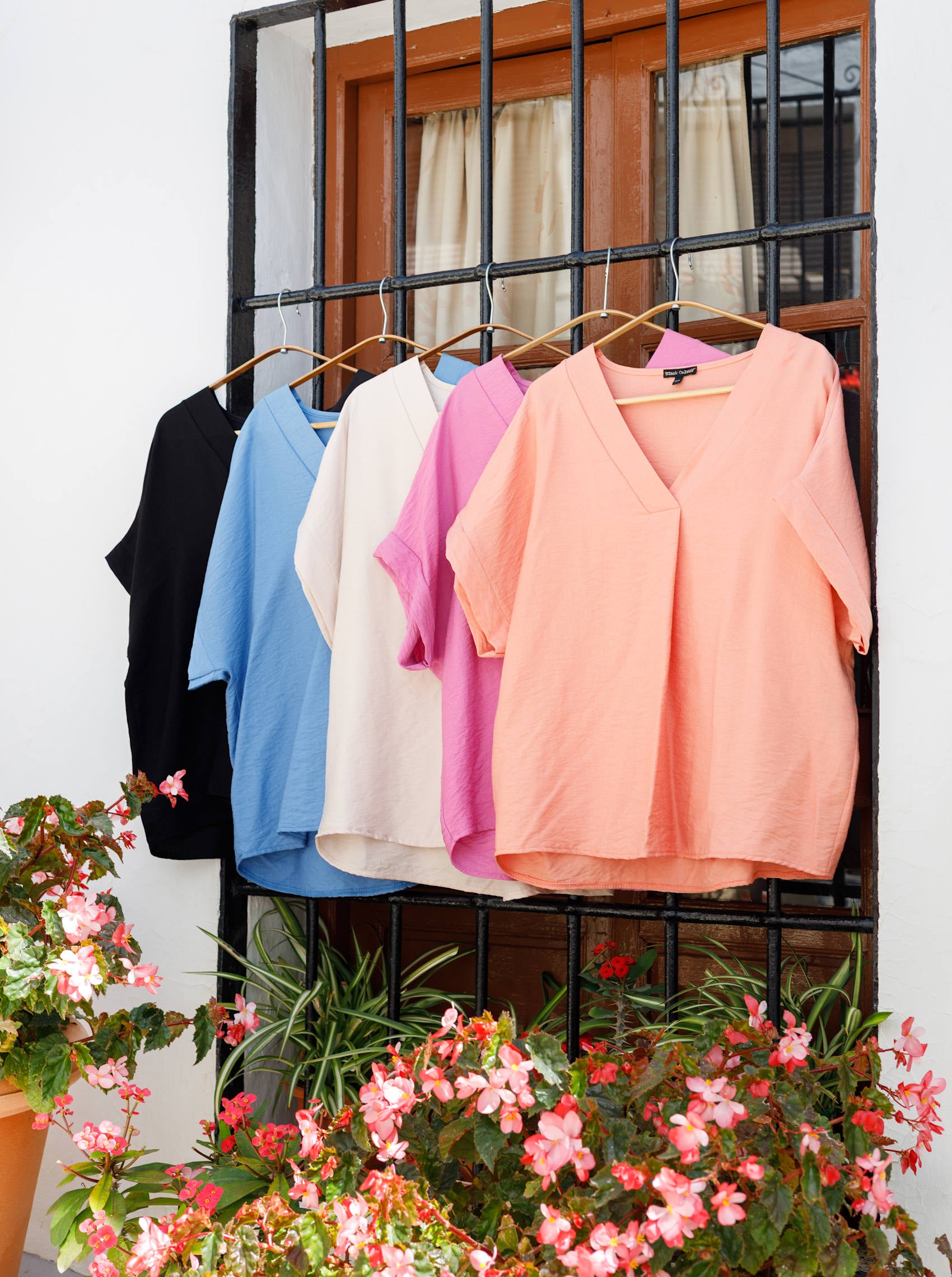 Die Samos Bluse ist eine leichte und luftige Bluse mit V-Ausschnitt und kurzen Ärmeln. Die Bluse hat eine lockere Passform und das schlichte Design macht sie ideal für legere und formellere Anlässe. Ein vielseitiger Style für die Sommergarderobe.