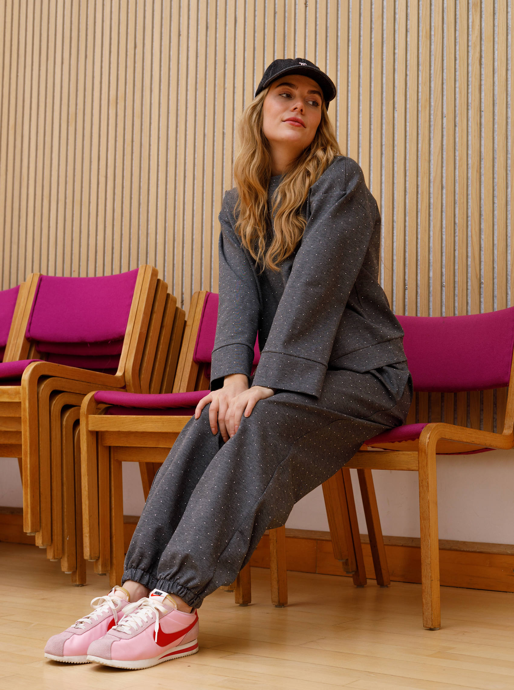 Unsere Simila Jogginghose ist eine stylische und moderne Jogginghose. Die Hose ist mit wunderschönen funkelnden Strasssteinen verziert, die eine ansonsten schlichte und lässige Hose aufpeppen. Die Simila Hose hat einen Gummizug in der Taille und am Hosenbein, was ihr eine entspannte und bequeme Passform verleiht. Zusätzlich hat sie praktische Seitentaschen.