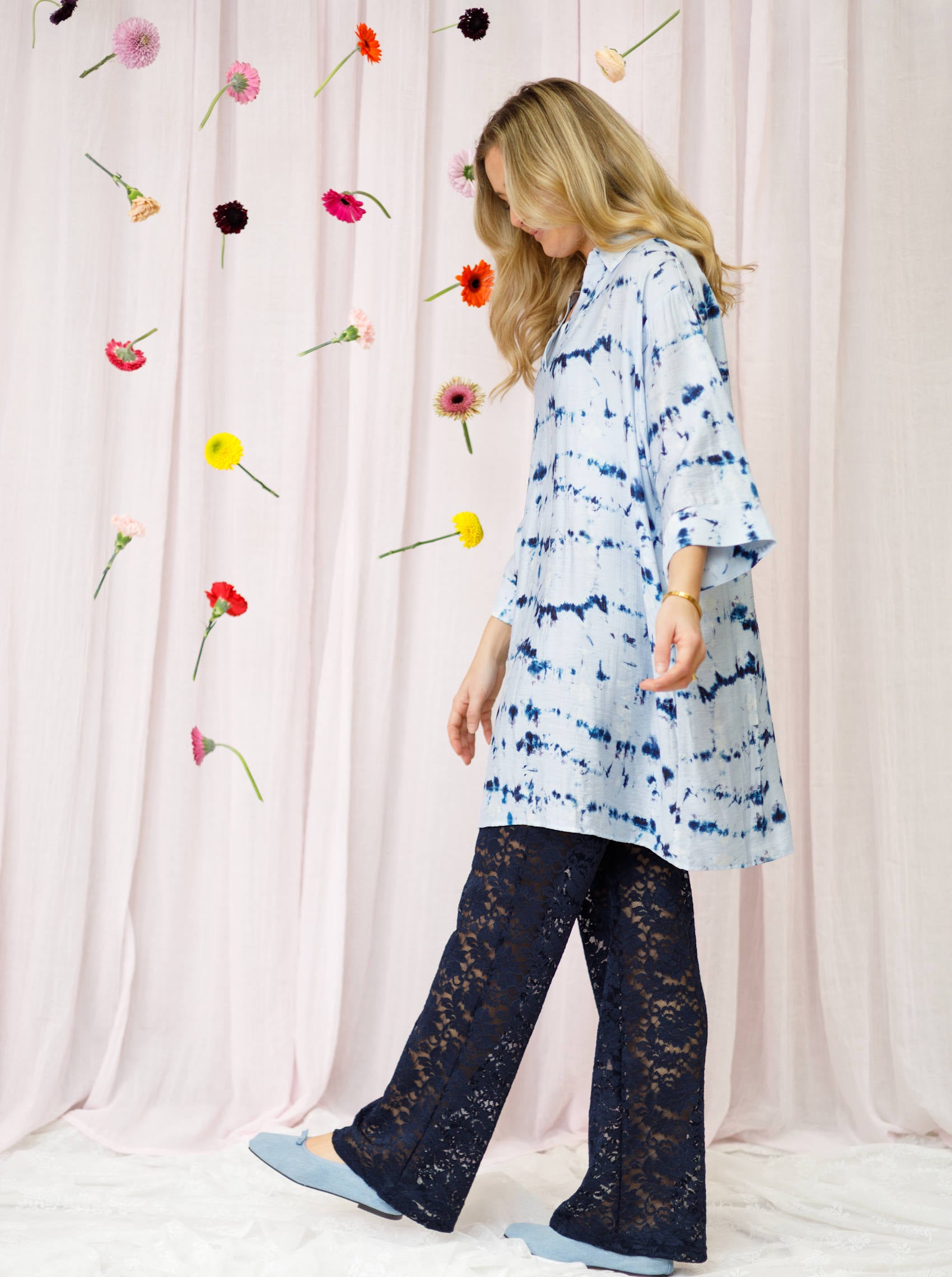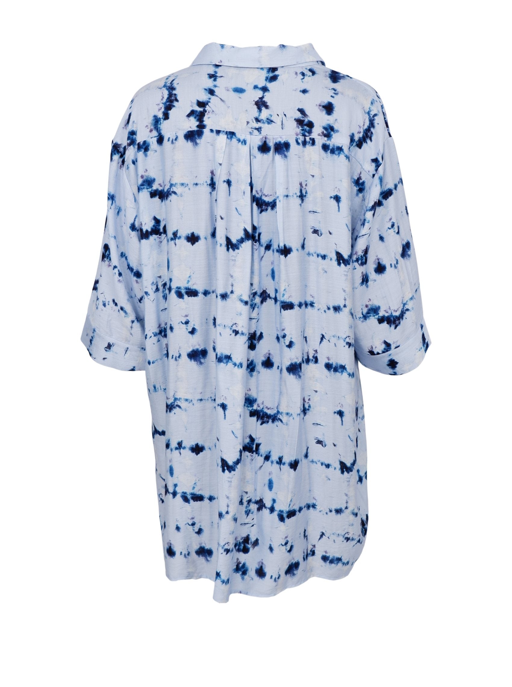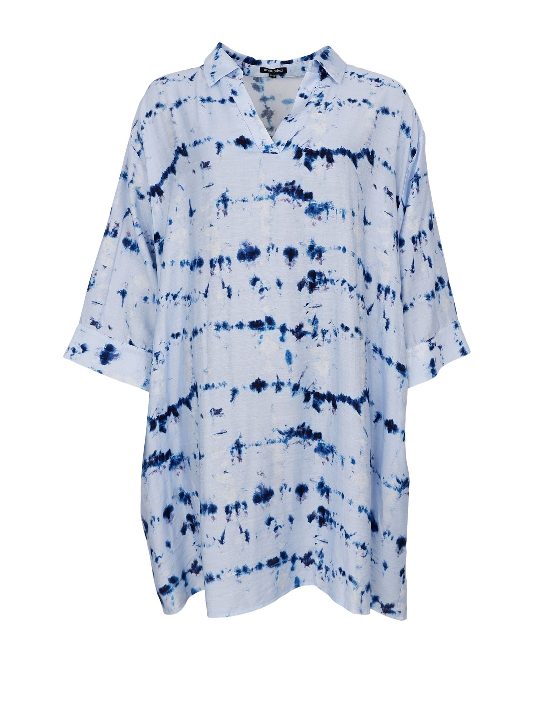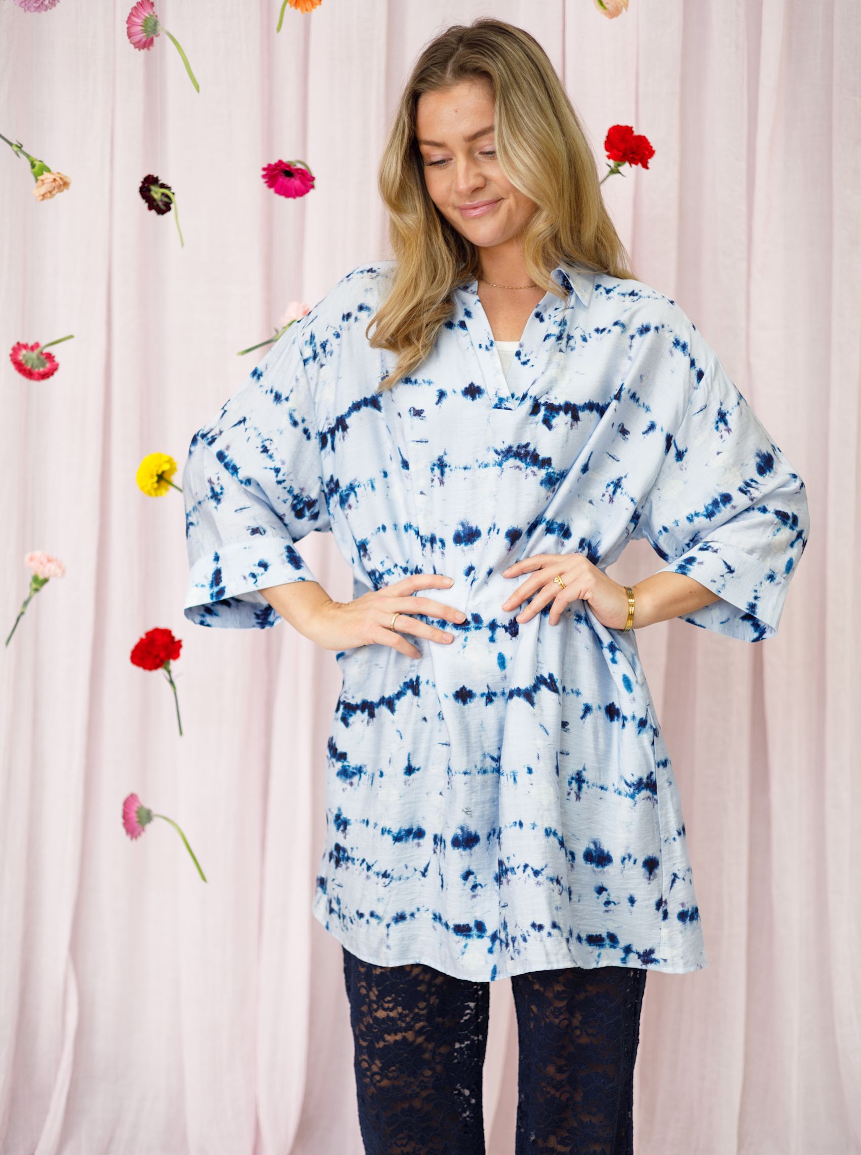 Unsere Thia-Tunika besteht aus weicher und atmungsaktiver Viskose, die einen luxuriösen, leichten Fall und ein angenehmes Tragegefühl auf der Haut bietet. Das wunderschöne blaue Muster verleiht dem lässigen Design eine raffinierte Eleganz. Die lockere Passform und das leichte Viskosematerial machen die Tunika ideal für warme und kühle Tage, da sie luftig und bequem ist. Dank ihrer vielseitigen Länge lässt sie sich problemlos als Kleid oder über der Hose für einen schicken Lagenlook stylen.
