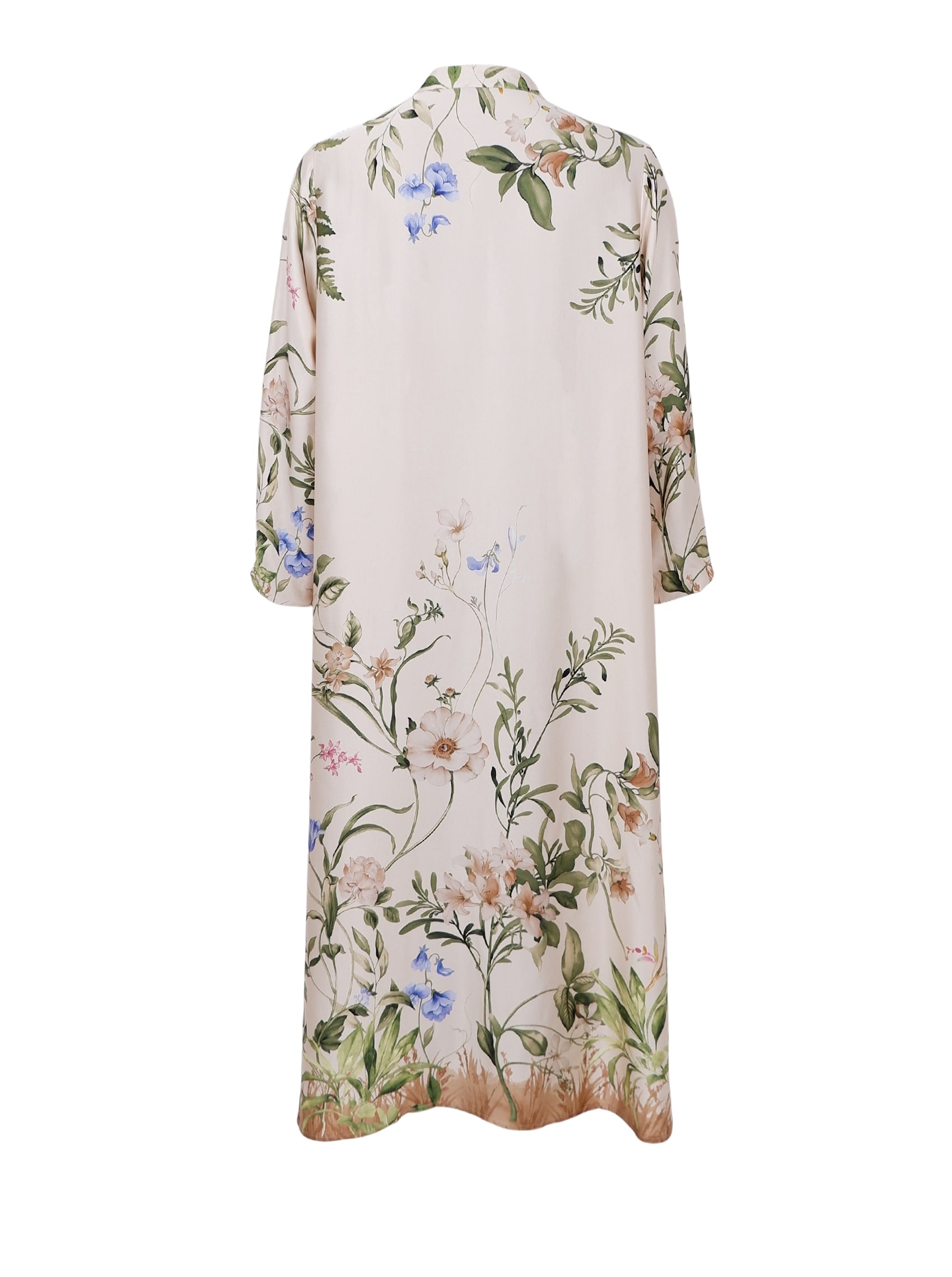 Unser Zennia Kleid ist ein langes Kleid aus glänzender Viskose mit einem wunderschönen Blumendruck in sanften Farben. Das Kleid hat einen Knopfverschluss vorne, einen Gummizug an den Handgelenken und eine elegante, lockere Passform. Perfekt für den Alltag und festliche Anlässe.