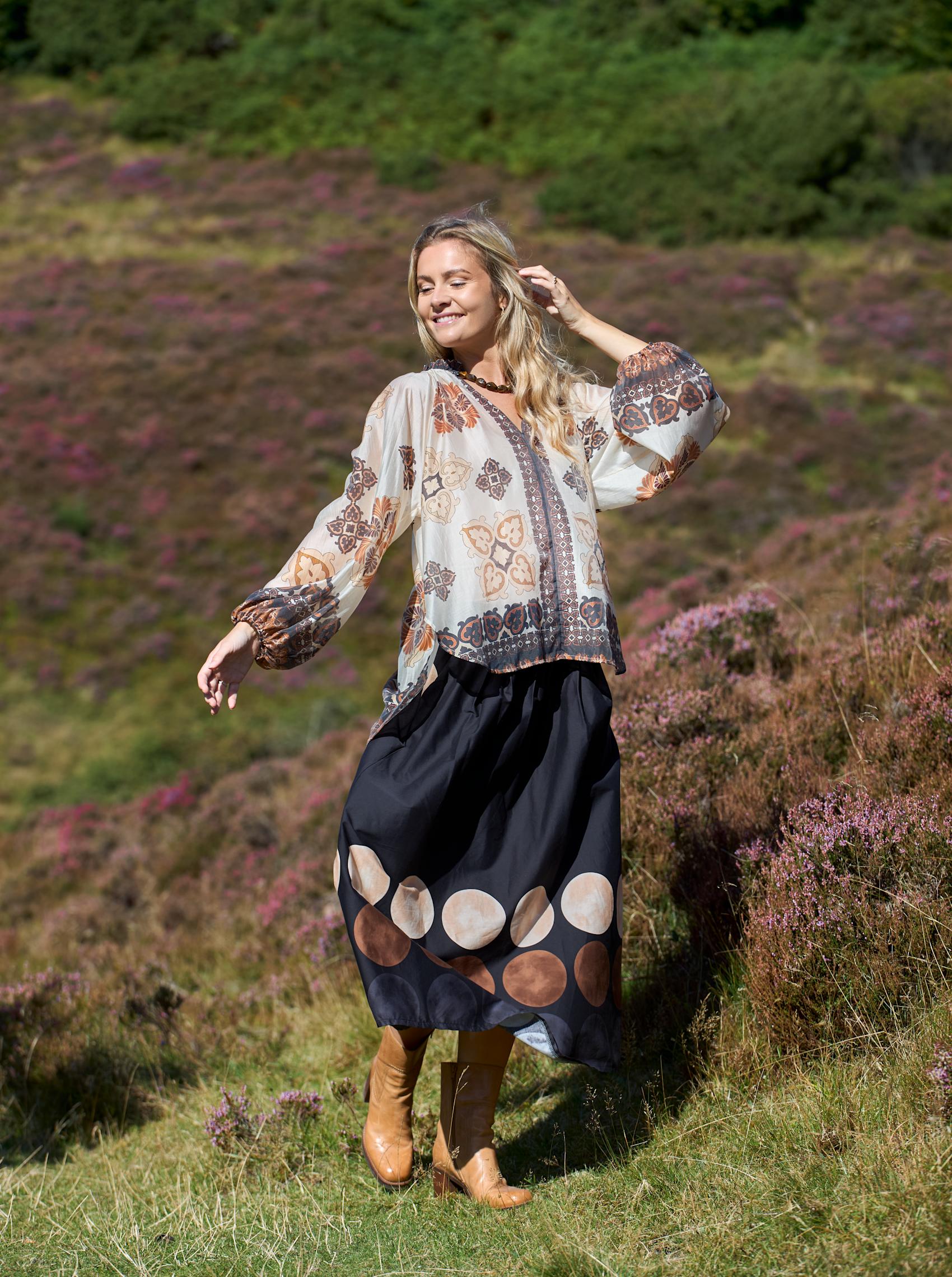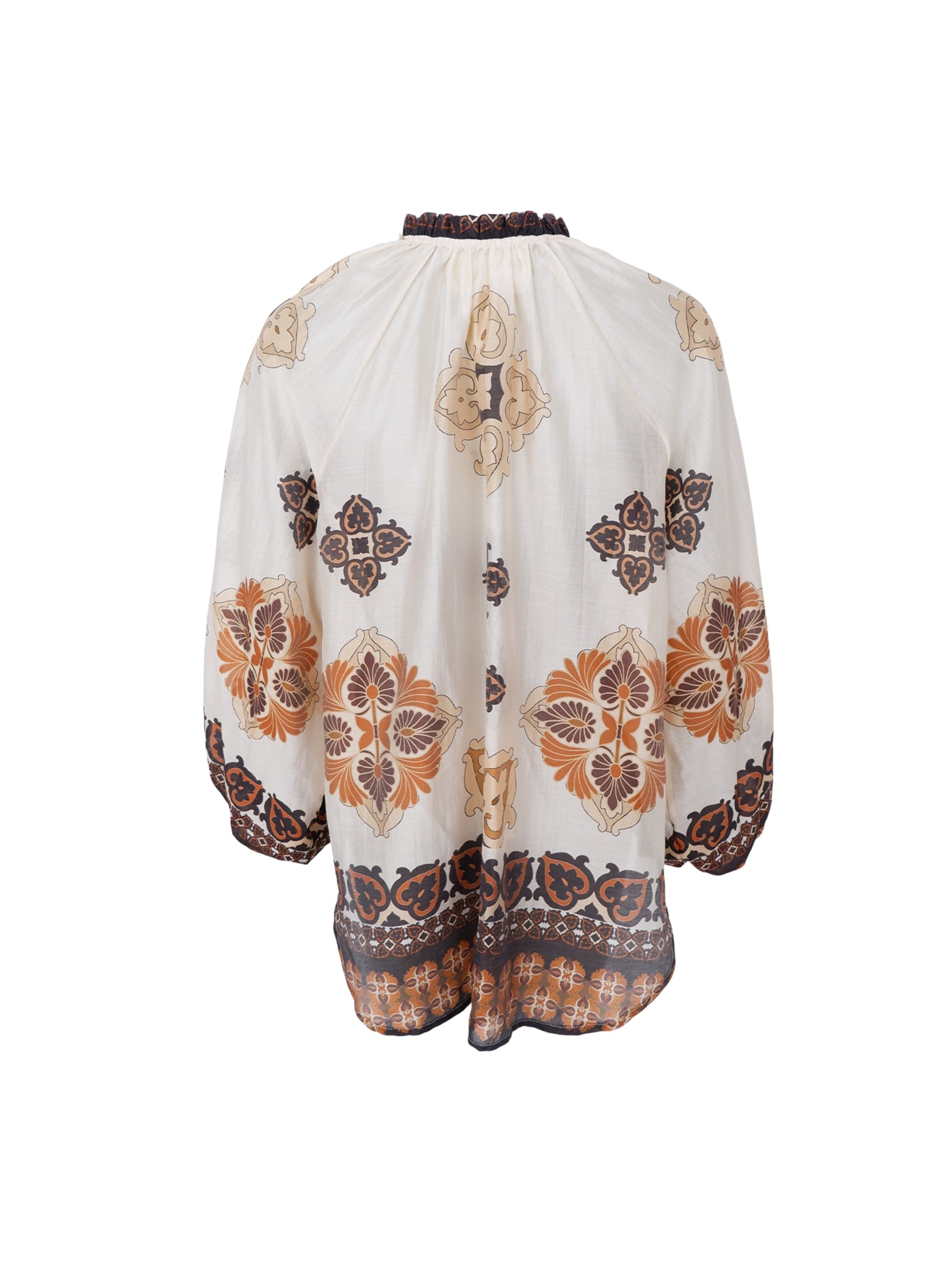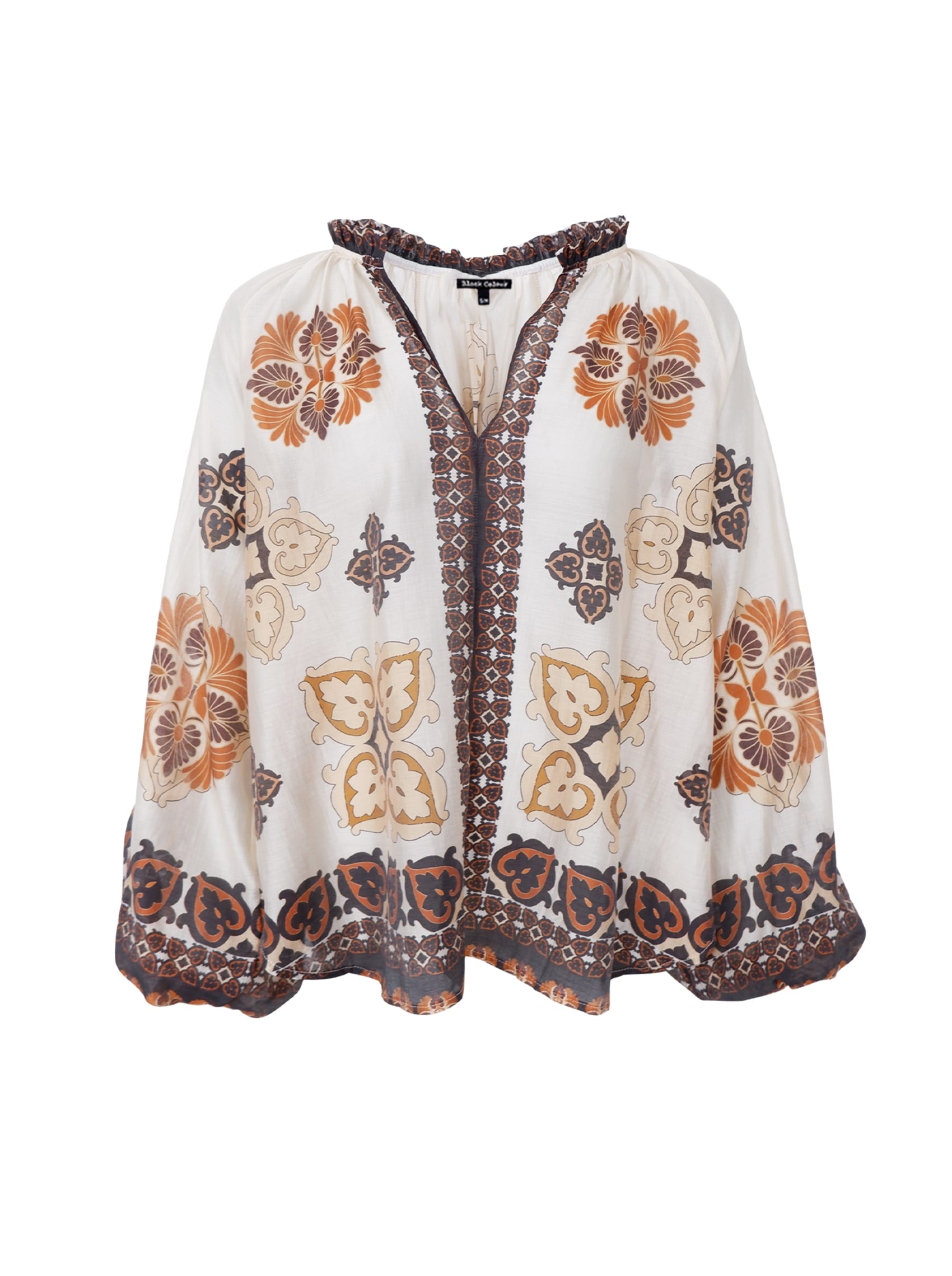 Die Hayley-Bluse ist eine leichte und luftige Bluse mit lockerer Passform und langen, weiten Ärmeln. Die Bluse hat einen V-Ausschnitt mit schmalen Banddetails und ein dekoratives Muster in warmen Farbtönen, das einen Bohème-inspirierten Look verleiht.
