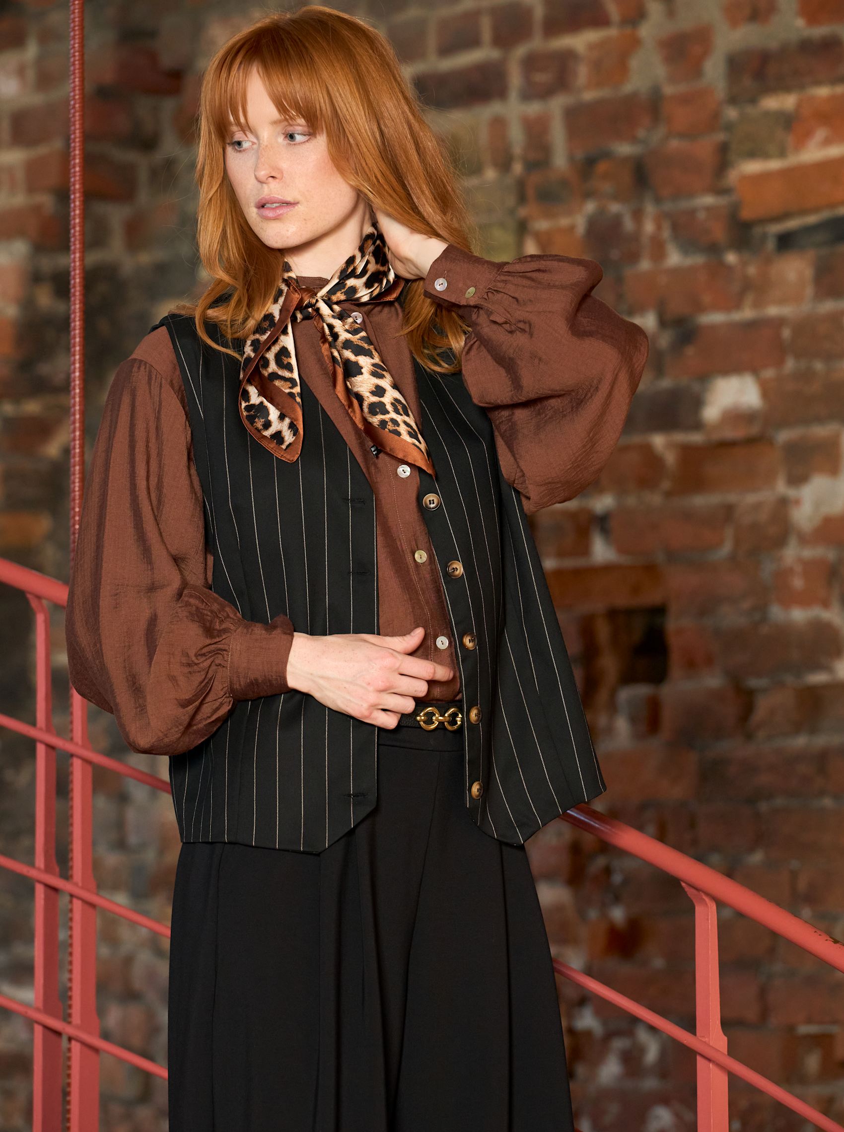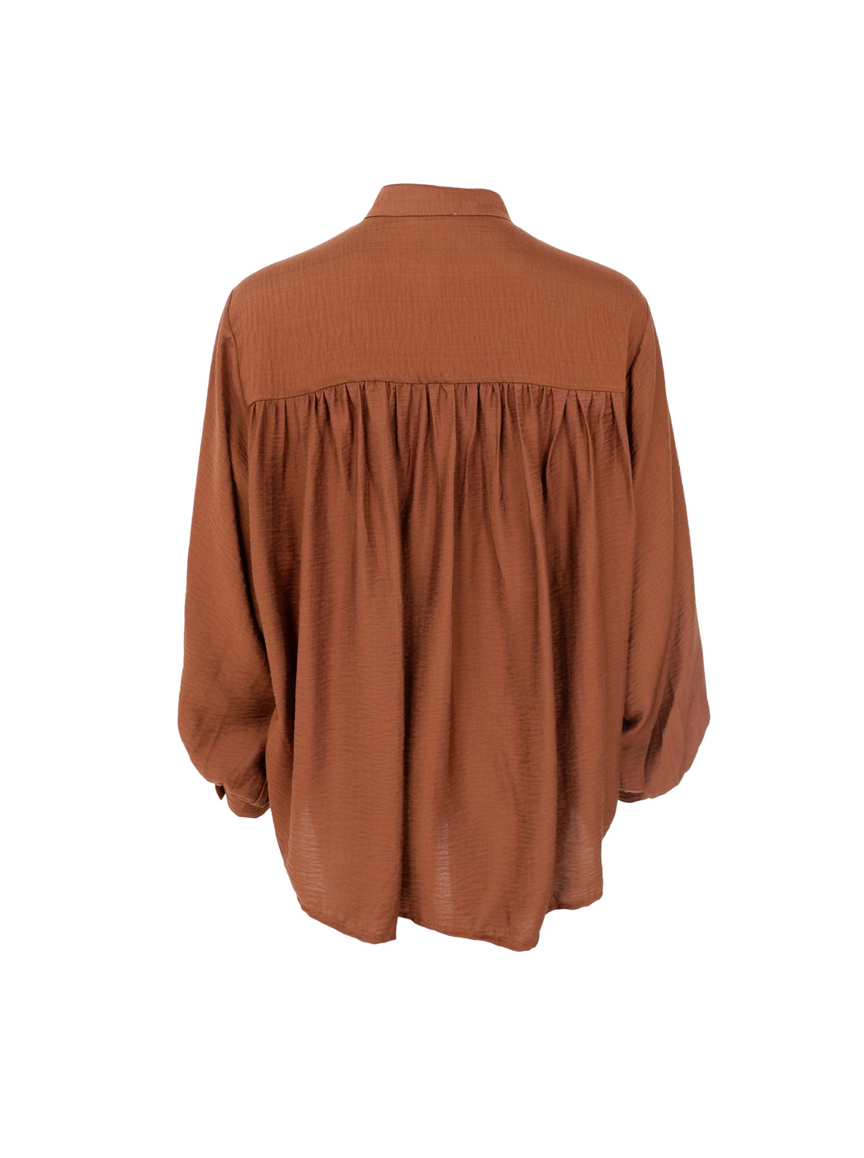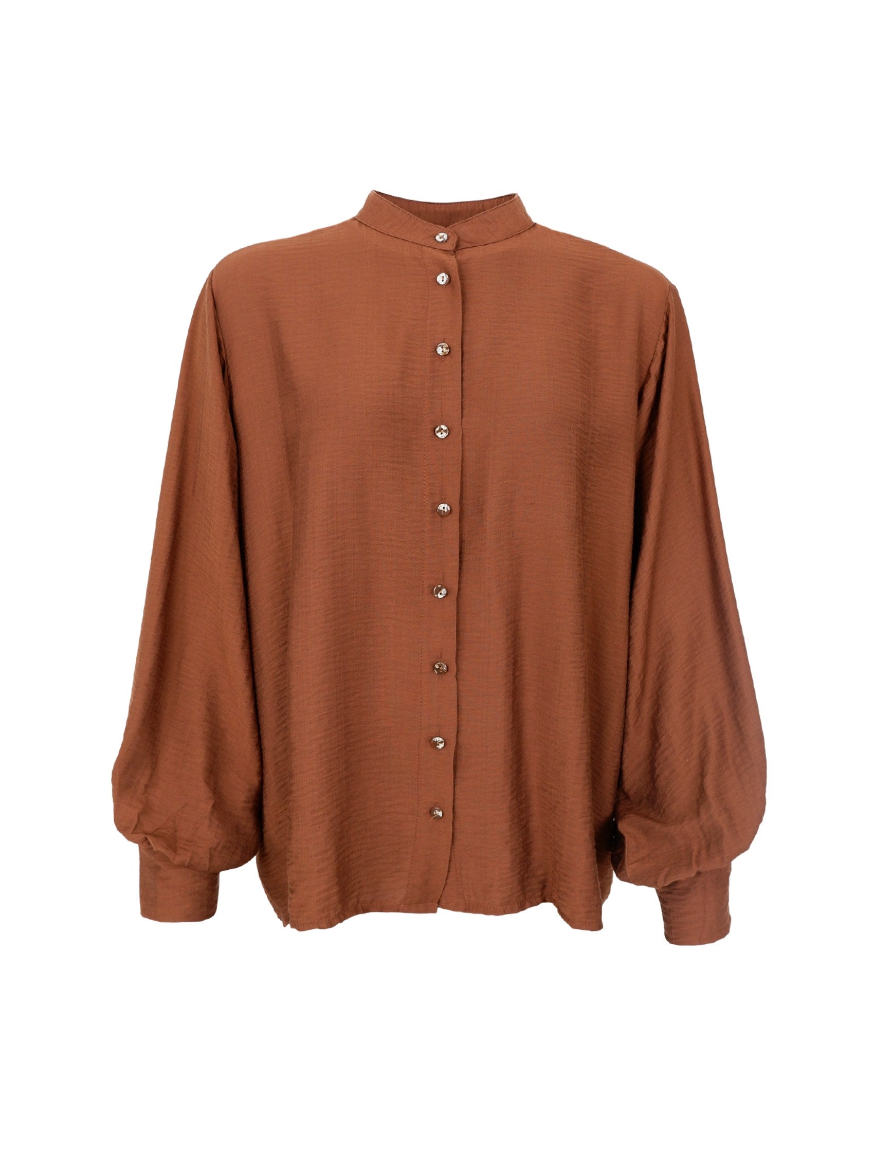 Schönes, lockeres Hemd in weicher und leicht strukturierter Qualität. Das Design hat einen klassischen Stehkragen, eine durchgehende Knopfleiste und lange Ballonärmel mit Manschetten. Das Modell ist geräumig und hat eine entspannte, übergroße Passform – perfekt für einen lässigen, aber eleganten Look.