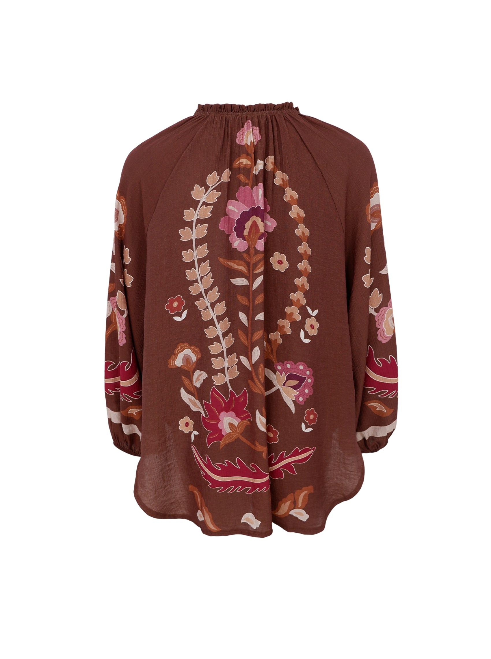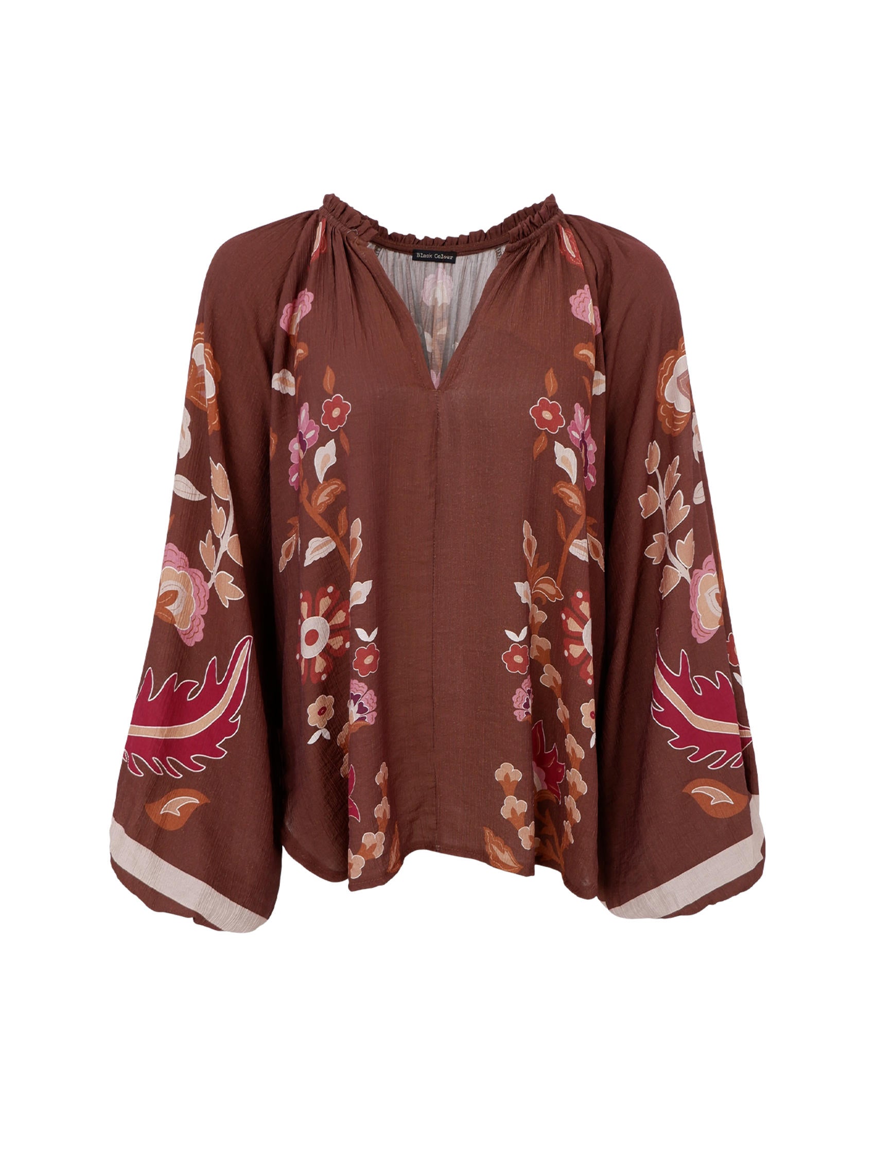 Lockere Bluse aus leichtem Lyocell-Material mit V-Ausschnitt und langen, weiten Ärmeln. Das Modell ist in schönen Herbst- und Winterfarben erhältlich und hat farbenfrohe Stickdetails auf Vorder- und Rückseite sowie an den Ärmeln, die für einen Bohème-inspirierten Look sorgen.