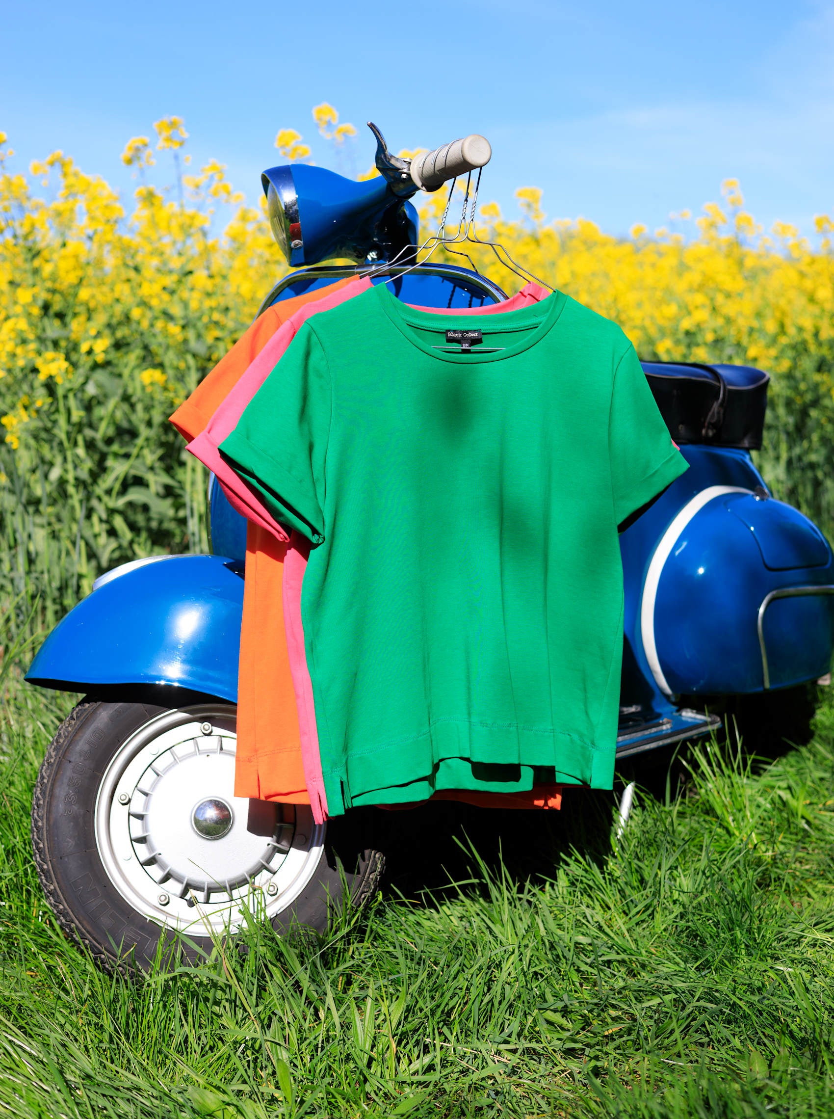 Unser kurzärmliges T-Shirt May ist ein schönes, locker sitzendes Baumwoll-T-Shirt mit Rundhalsausschnitt und einer kleinen Falte an den Ärmeln. Die Bluse ist unifarben und ganz schlicht, was sie unglaublich vielseitig macht, da sie sich mit fast allem kombinieren lässt.