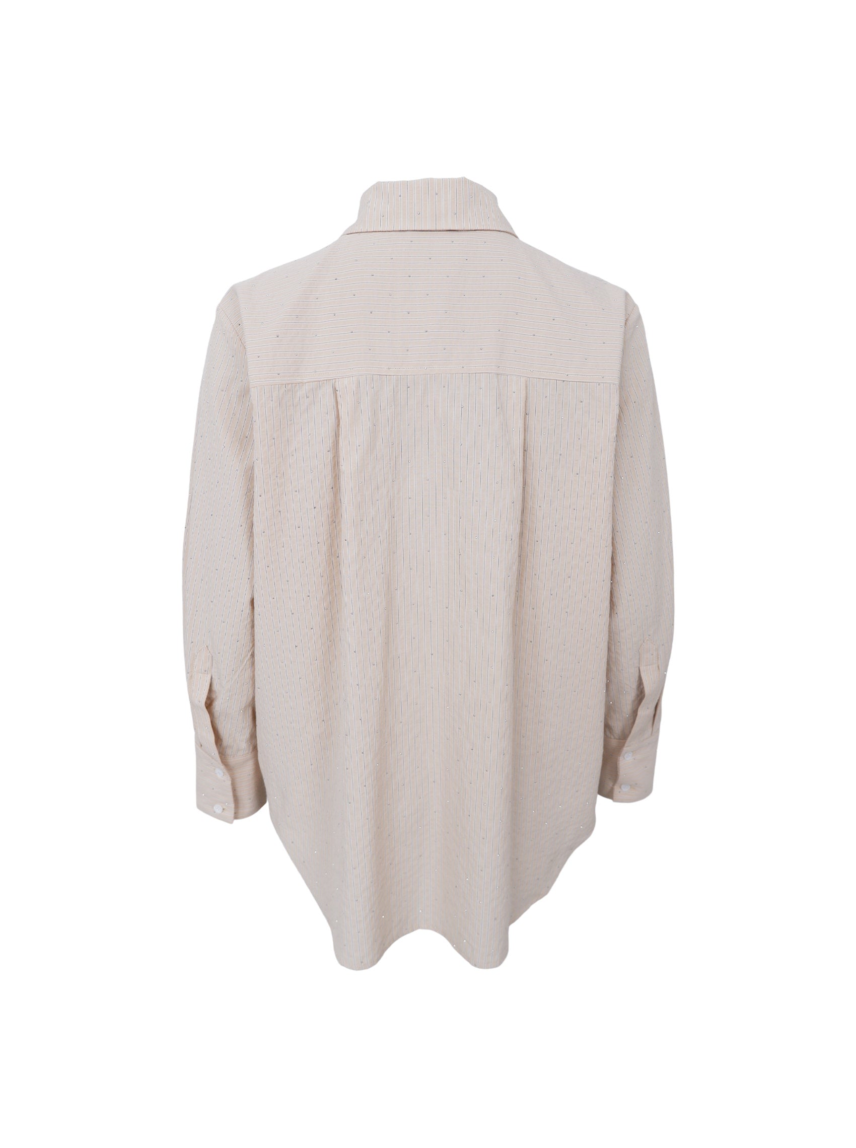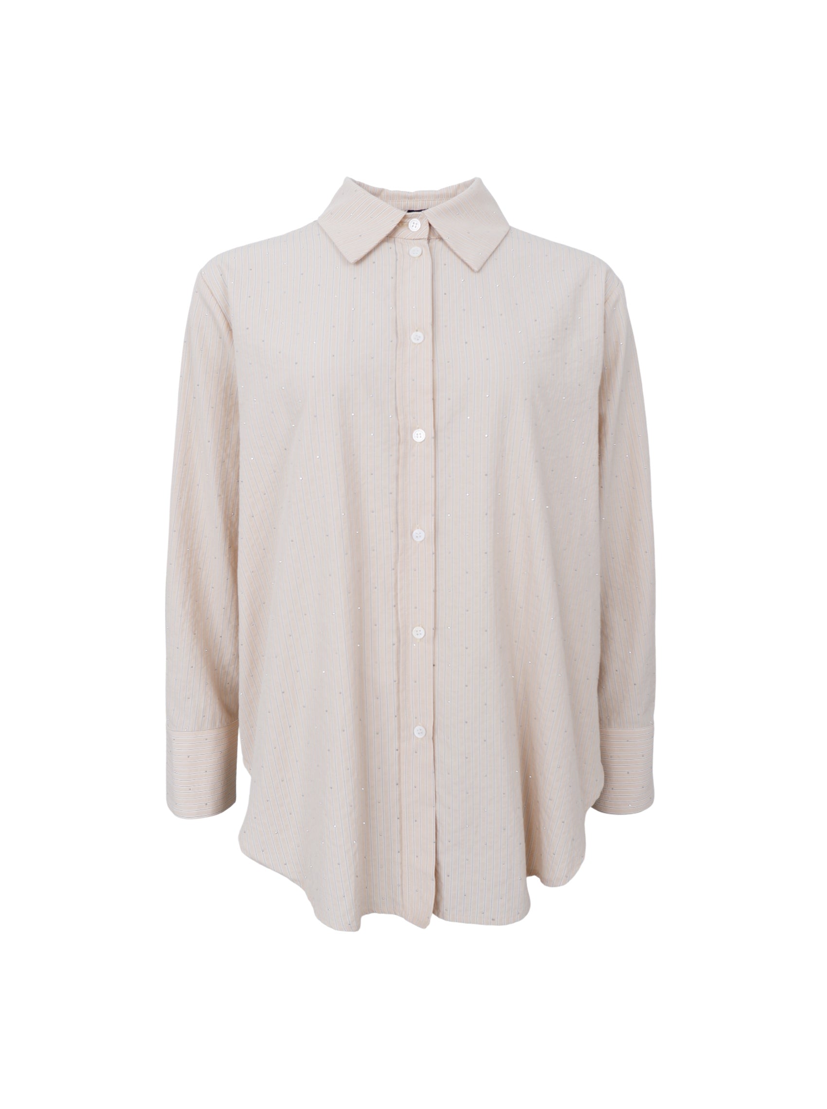 Das Starry-Shirt ist mit seinen vielen feinen Details und seinem modernen Ausdruck ein absolutes Must-have. Das Shirt ist ein übergroßes gestreiftes Seersucker-Shirt, das über und über mit feinsten kleinen Strasssteinen besetzt ist.