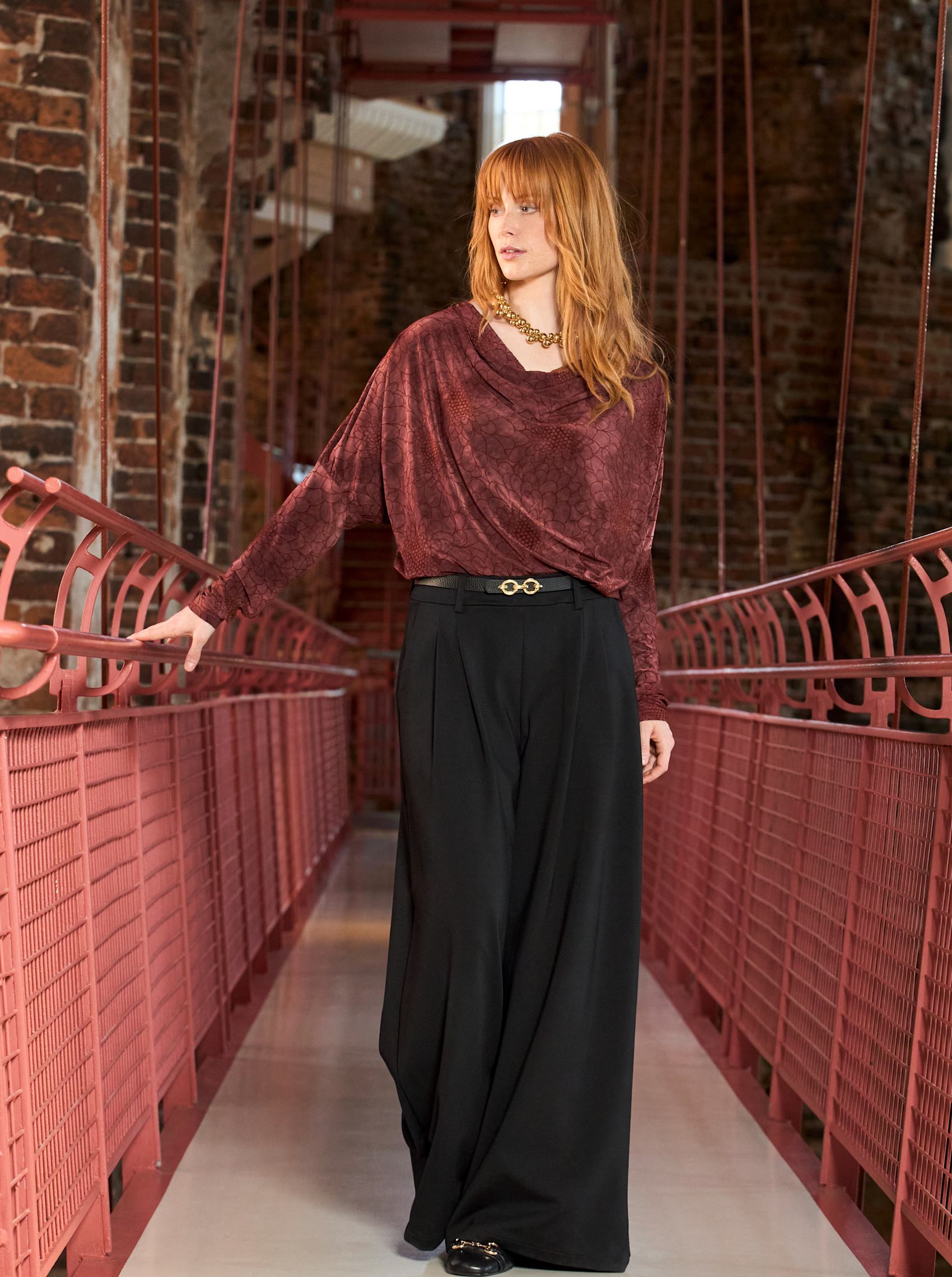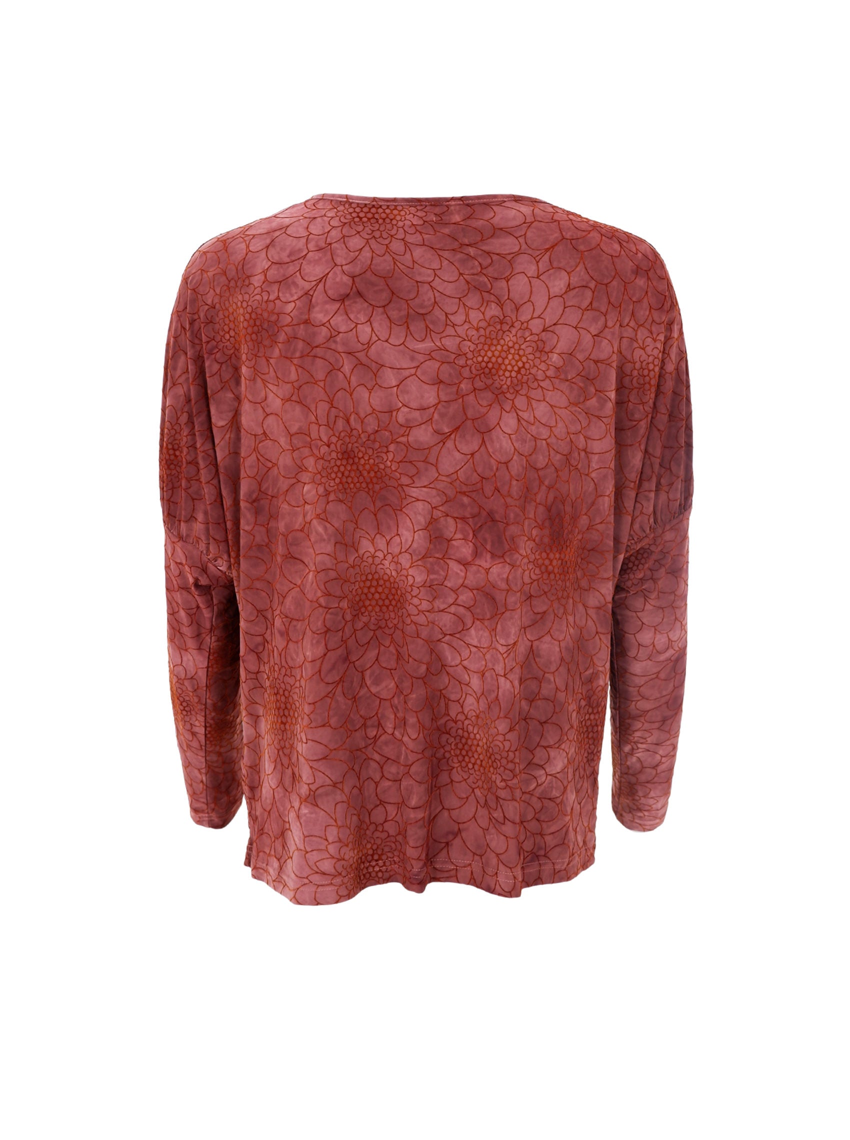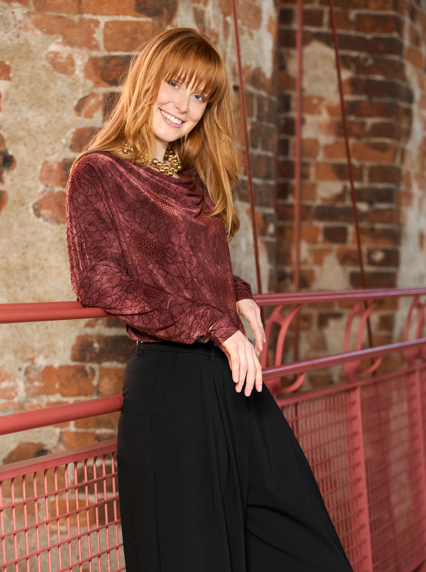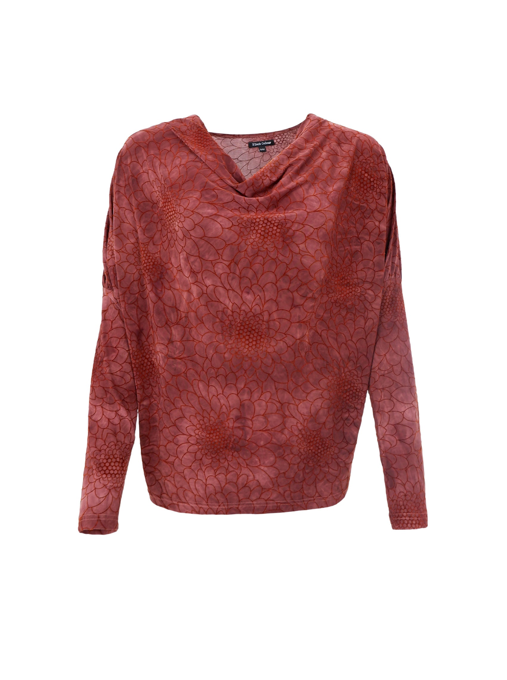 Leichte und elegante Bluse mit langen Ärmeln, dezentem Blumenmuster und wunderschönem drapiertem Ausschnitt. Die Bluse eignet sich perfekt, um festlichen Anlässen eine feminine Note zu verleihen.