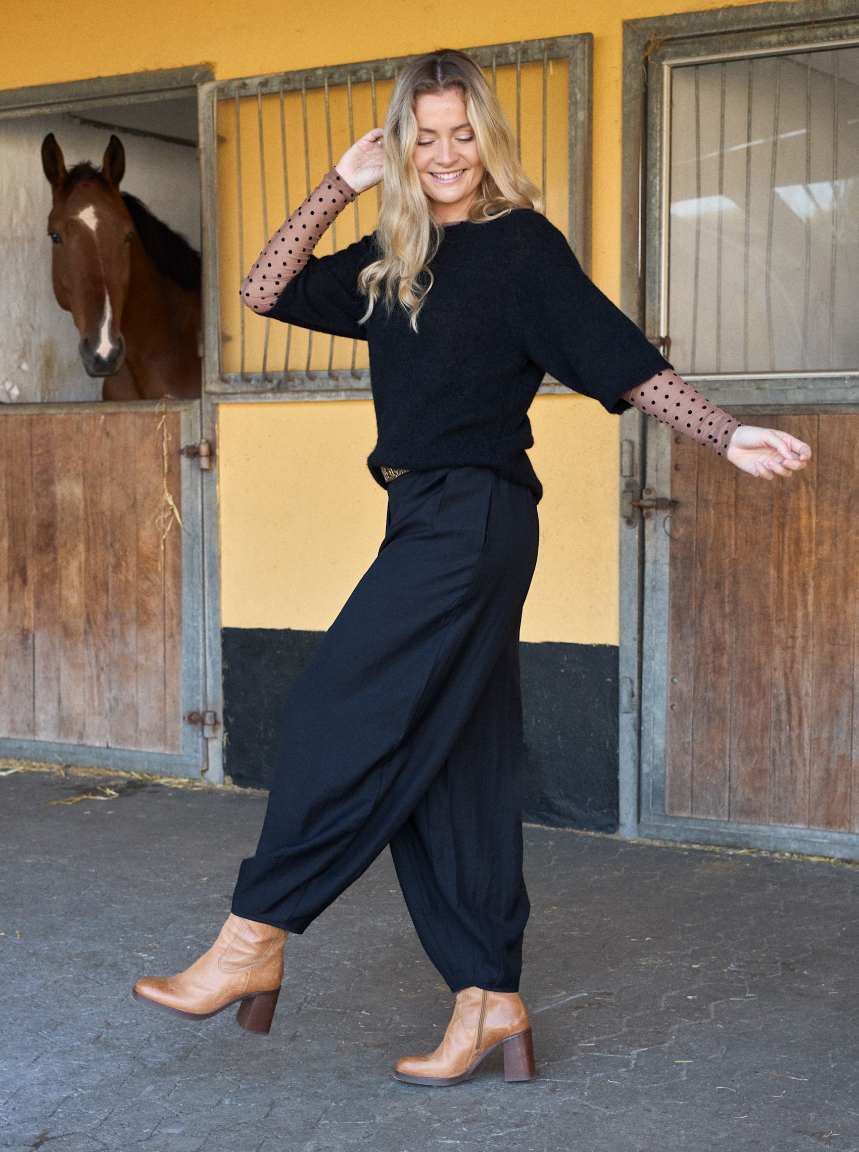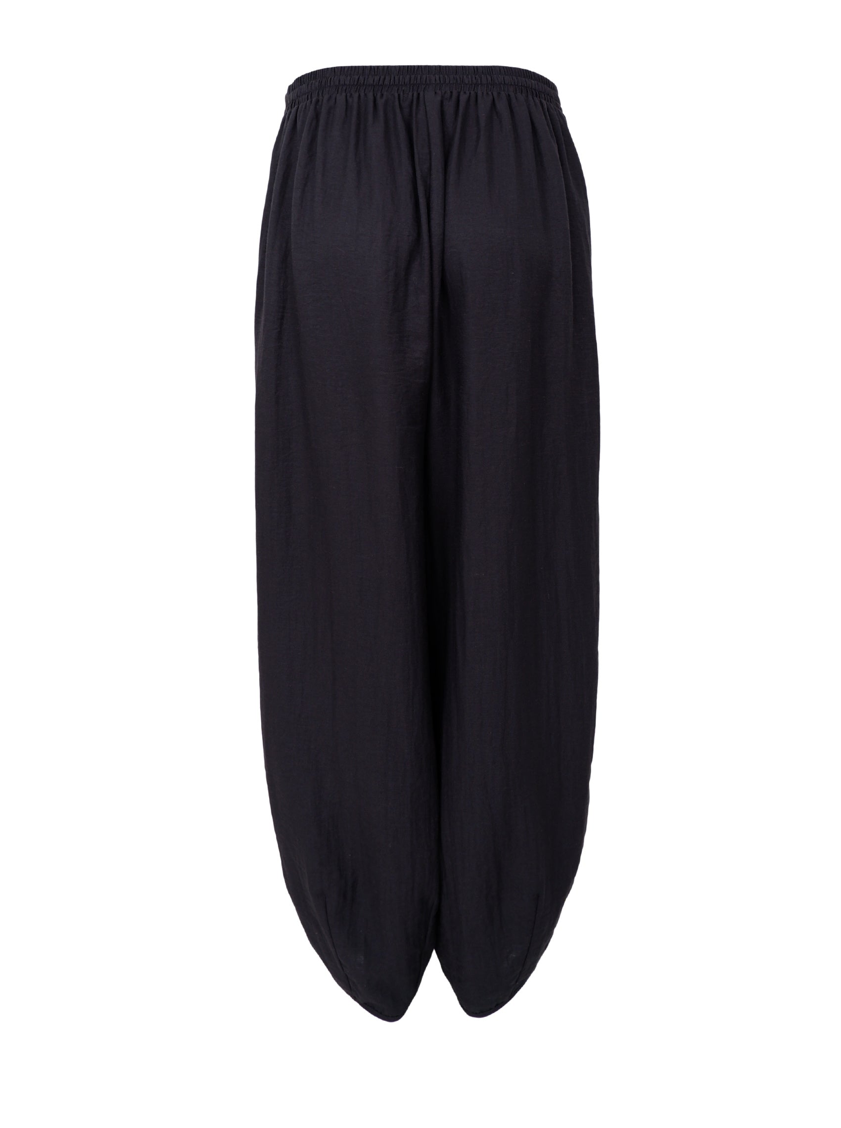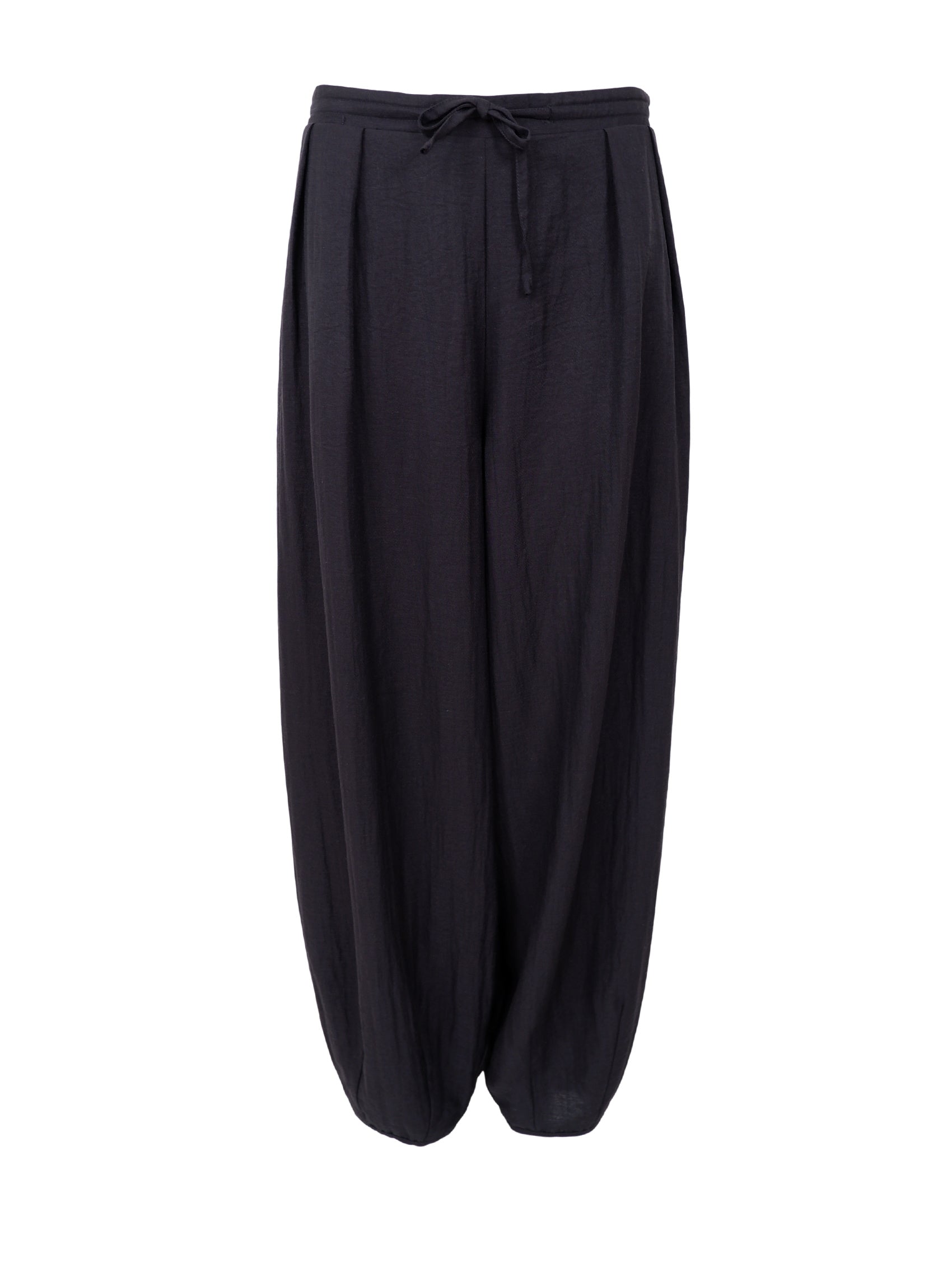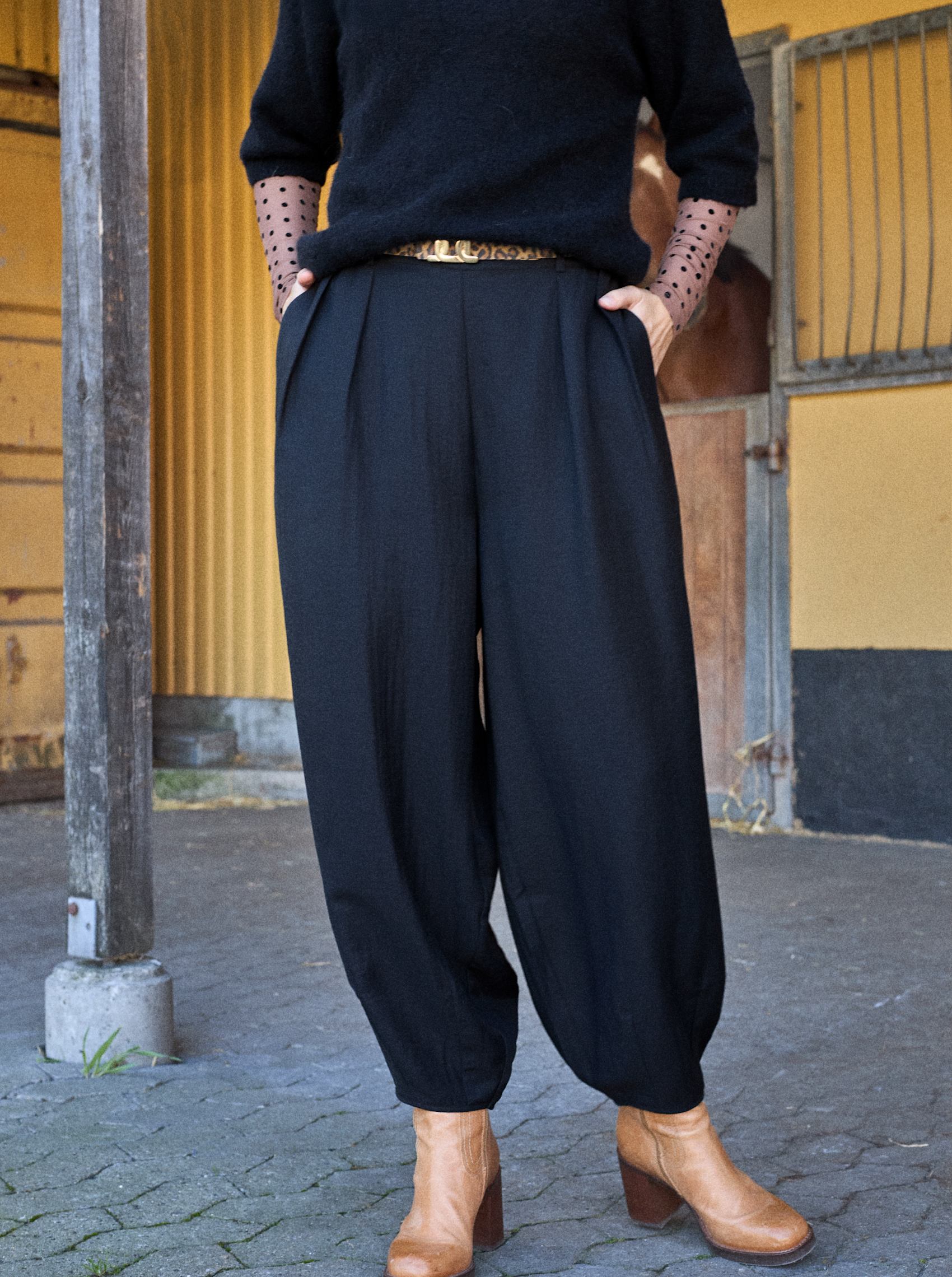 Unsere Abu-Hose ist eine stylische Ballonhose aus leichtem und bequemem Material mit lockerer Passform und praktischen Seitentaschen. Das Modell hat Falten vorne und einen Gummizug in der Taille hinten, was für eine bequeme und entspannte Silhouette sorgt.