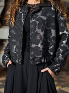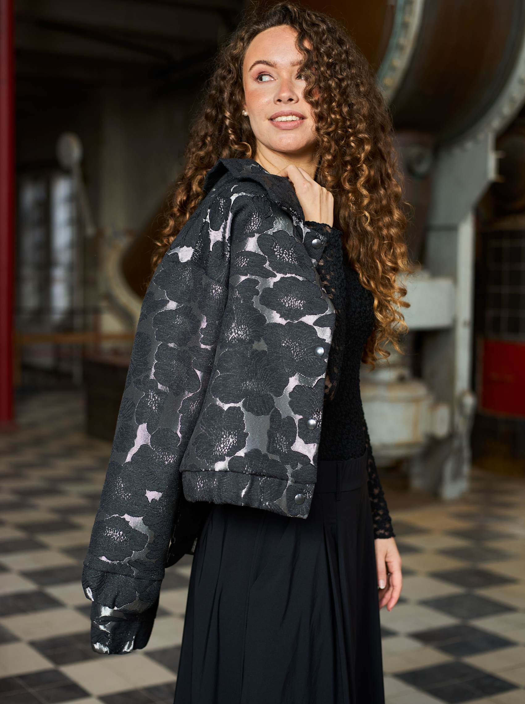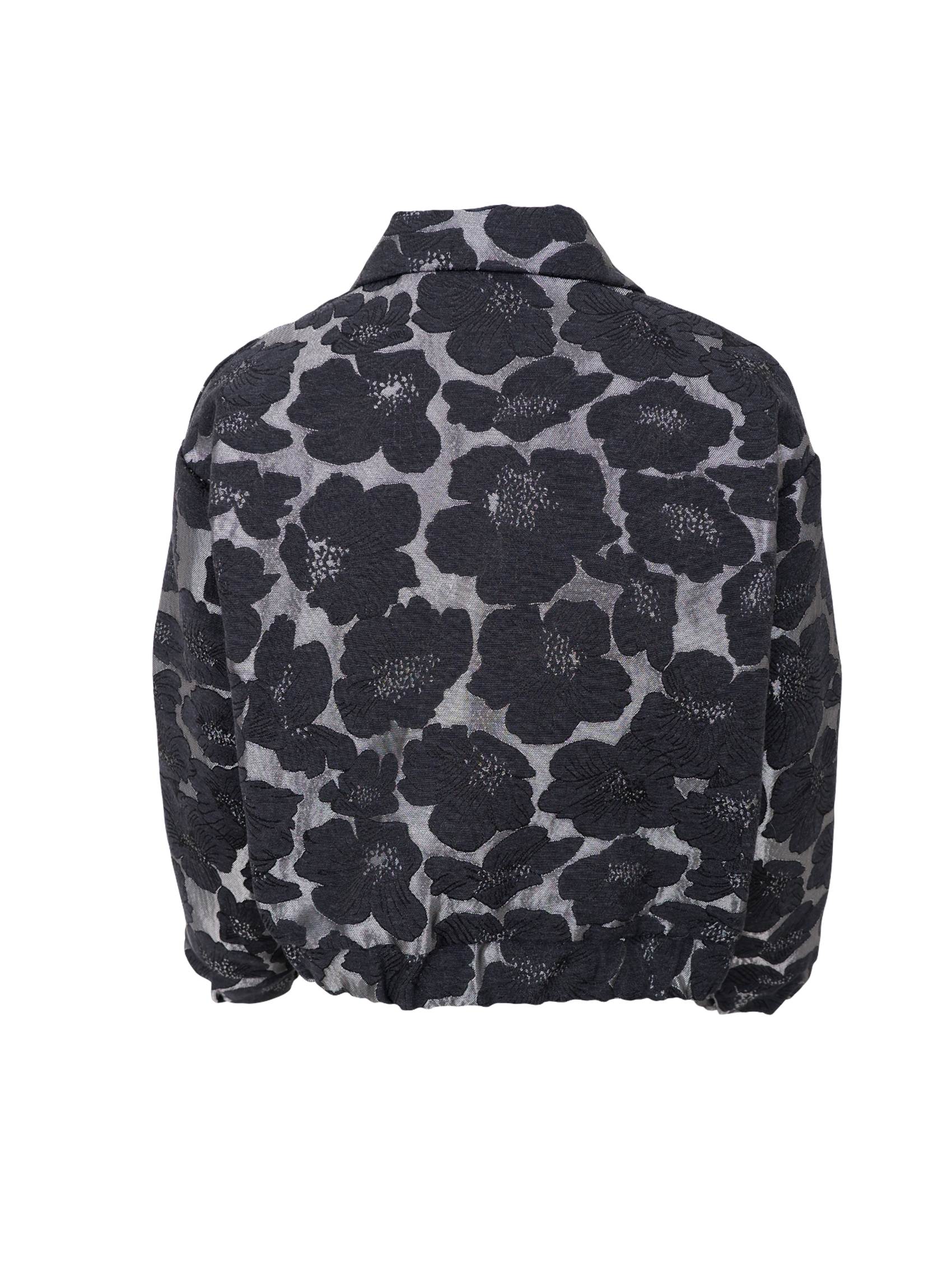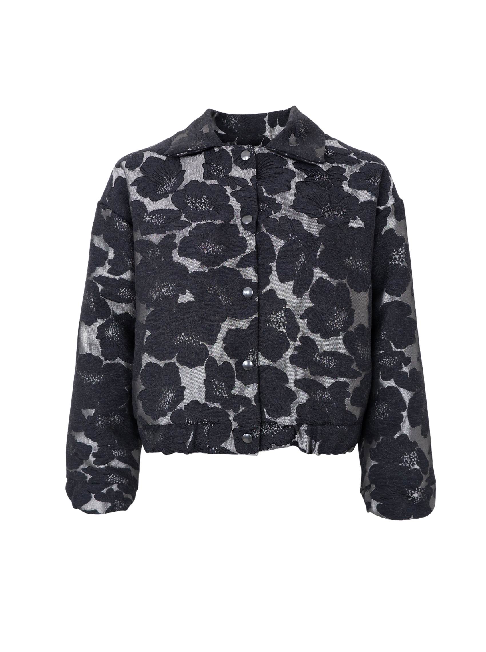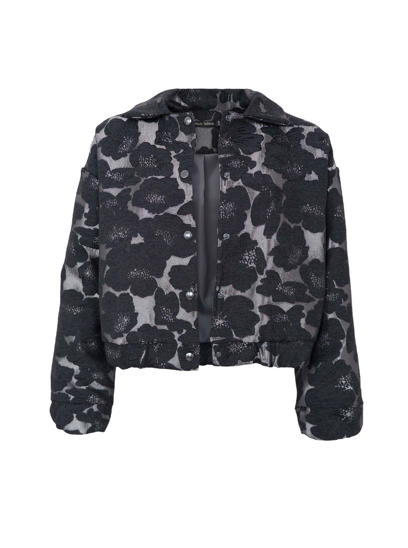 Kurze Bomberjacke mit coolem Blumenmuster. Die Jacke hat einen klassischen Kragen, Druckknöpfe vorne und einen elastischen Saum für eine schmeichelhafte Passform. Die Ärmel sind mit einem Gummizug versehen, was für einen lässigen und modernen Look sorgt.