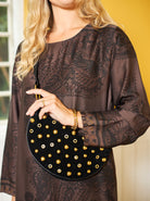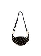 Trendige Umhängetasche in Wildlederoptik mit goldenen Nieten auf der Vorderseite. Die Tasche hat eine abgerundete Form, einen Reißverschluss und einen verstellbaren Schultergurt, der eine individuelle Gestaltung ermöglicht. Ein cooles Statement-Piece, das jedem Outfit Stil und Stil verleiht.