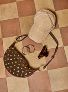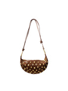 Trendige Umhängetasche in Wildlederoptik mit goldenen Nieten auf der Vorderseite. Die Tasche hat eine abgerundete Form, einen Reißverschluss und einen verstellbaren Schultergurt, der eine individuelle Gestaltung ermöglicht. Ein cooles Statement-Piece, das jedem Outfit Stil und Stil verleiht.