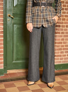 Klassische Hose mit glitzernden vertikalen Details. Die Hose hat Gürtelschlaufen, Knopf- und Reißverschluss und eine gerade Passform, die einen zeitlosen und eleganten Look verleiht. Perfekt für den Alltag und formellere Anlässe.