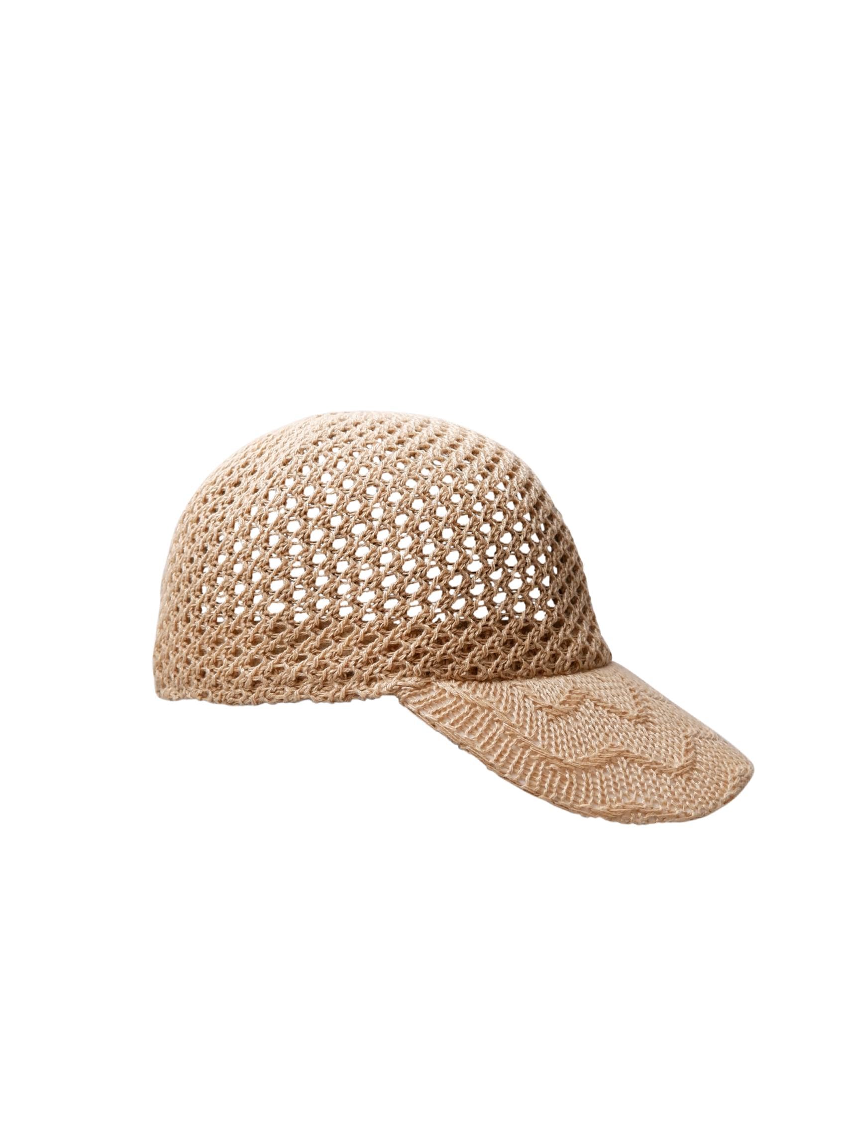 Coole Cap in leichter Häkeloptik – perfekt für heiße Sommertage. Die offene Struktur sorgt für gute Belüftung und einen lässigen Look, während der Schirm vor der Sonne schützt.