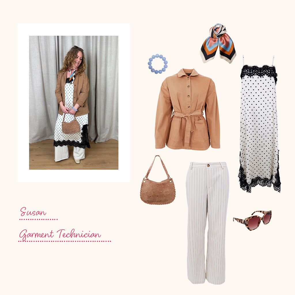 Susan has a playful sense of style and enjoys combining different materials in a single look.