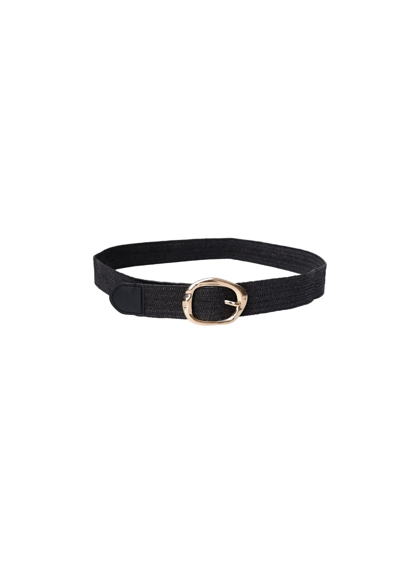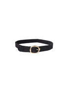 Elastischer Gürtel in Schwarz und Camel mit goldfarbener Schnalle. Ein stilvoller und flexibler Gürtel für die Taille, der Ihren Lieblingskleidern eine elegante Note verleiht.