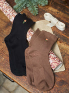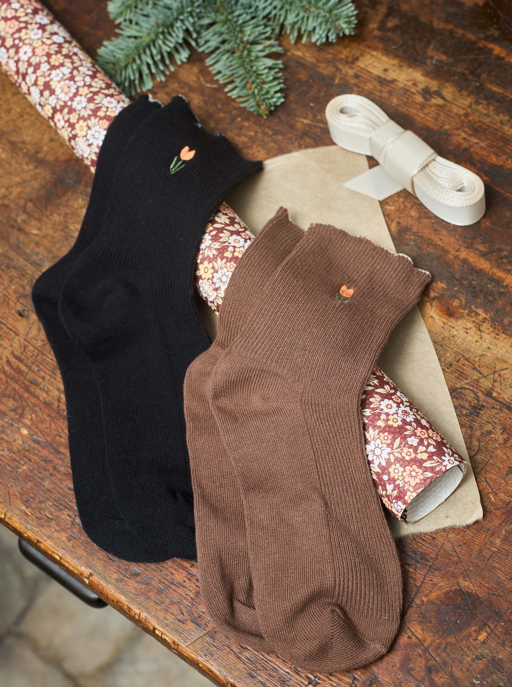 Wunderschöner Strumpf mit kleiner gestickter Blume und gewelltem Rand.