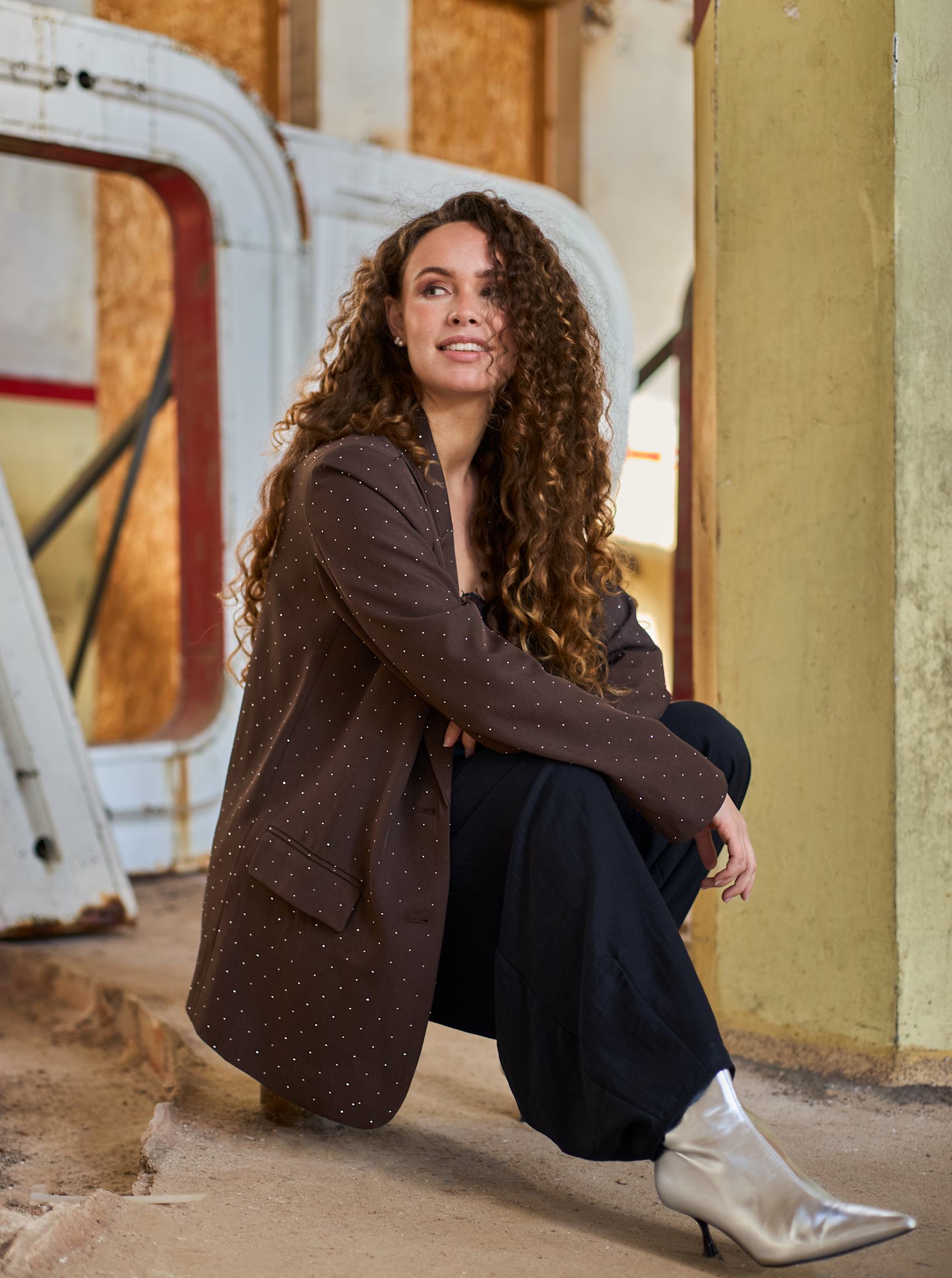 Eleganter brauner Blazer mit wunderschönen Strasssteinen und klassischem Revers. Der Blazer hat eine Passform, die eine raffinierte und feminine Silhouette zaubert. Perfekt zu Jeans für einen lässigen Look oder über einem Kleid für einen eleganteren Auftritt.