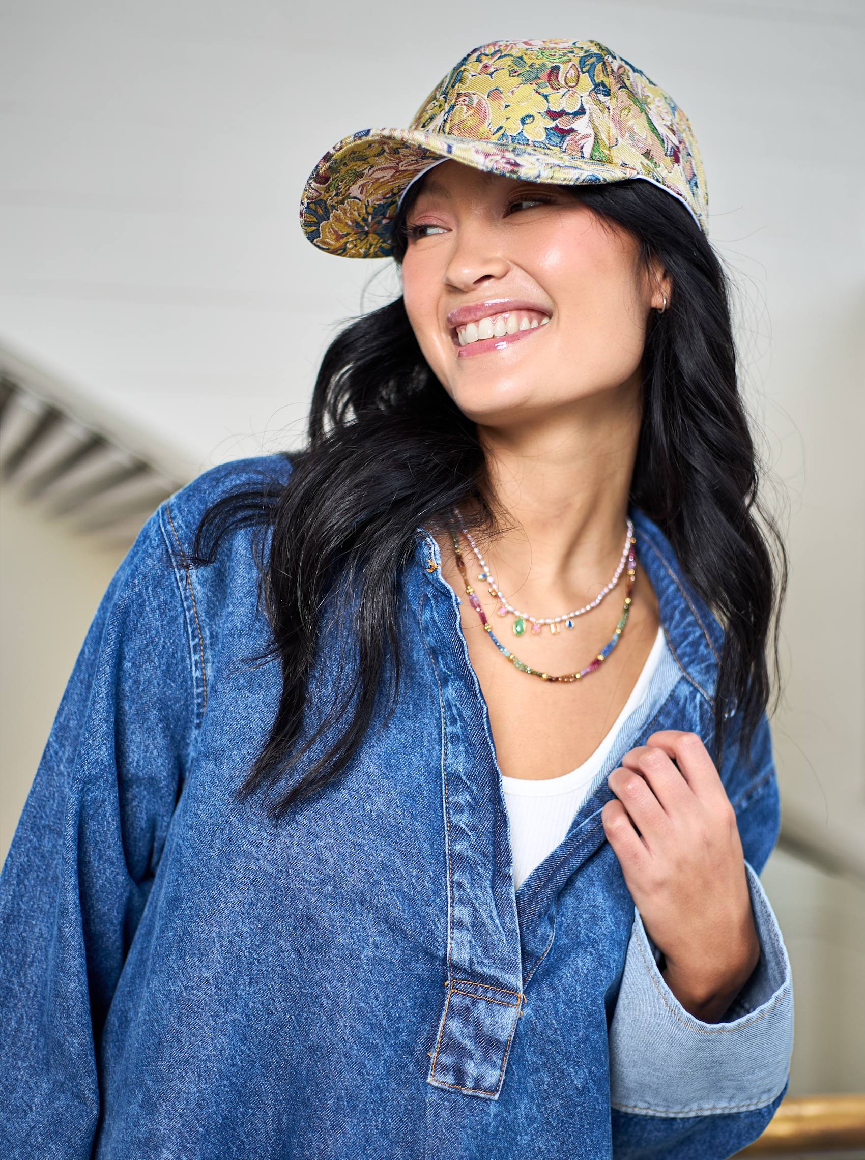 Diese Kappe besticht durch ein dekoratives Blumenmuster, das einen künstlerischen und individuellen Ausdruck verleiht. Dank des verstellbaren Riemens am Hinterkopf lässt sie sich den ganzen Tag über angenehm tragen.