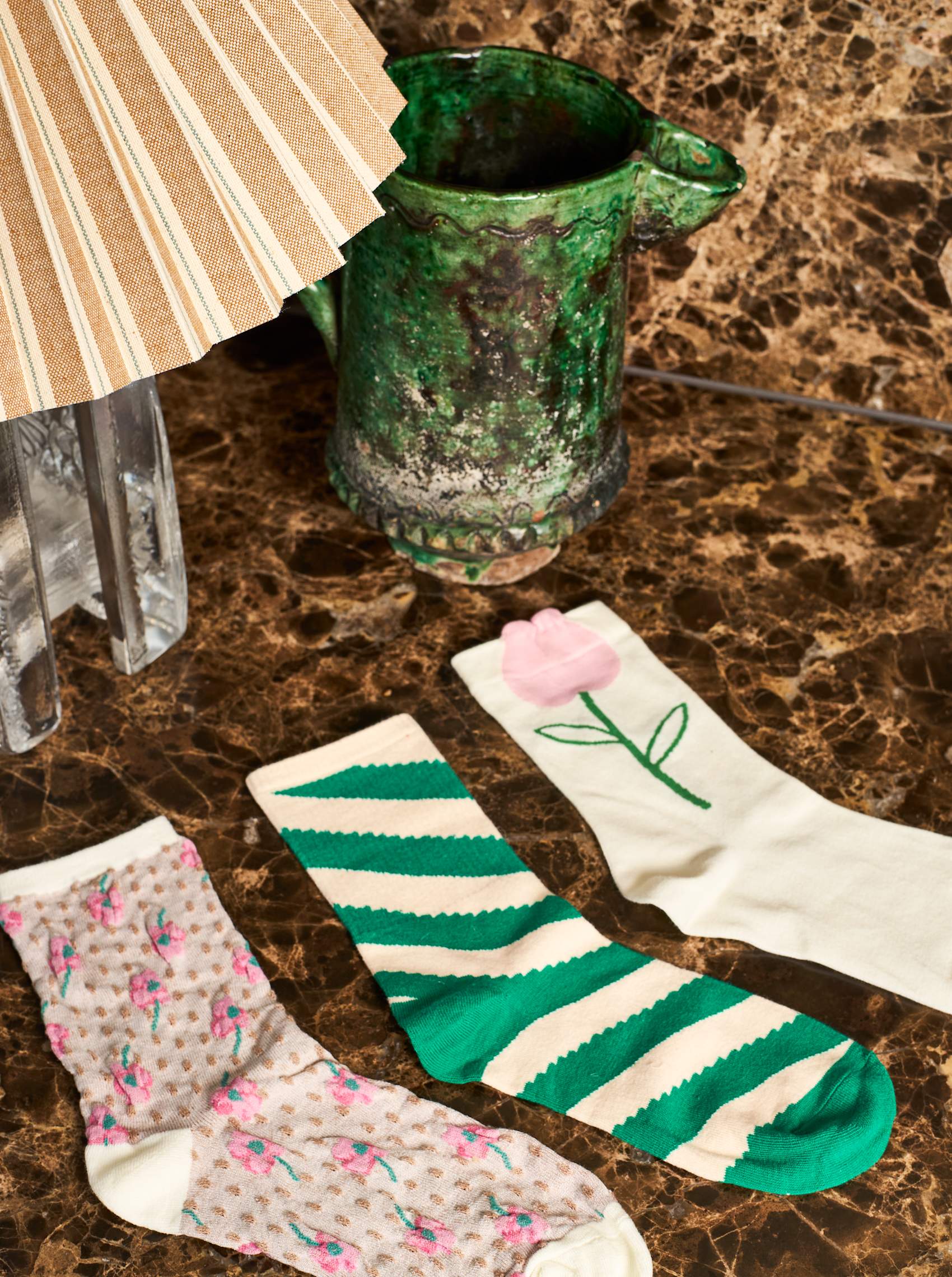 Der Strumpf Elira ist mit einer dekorativen Blume verziert, die ihm einen frischen und verspielten Look verleiht.