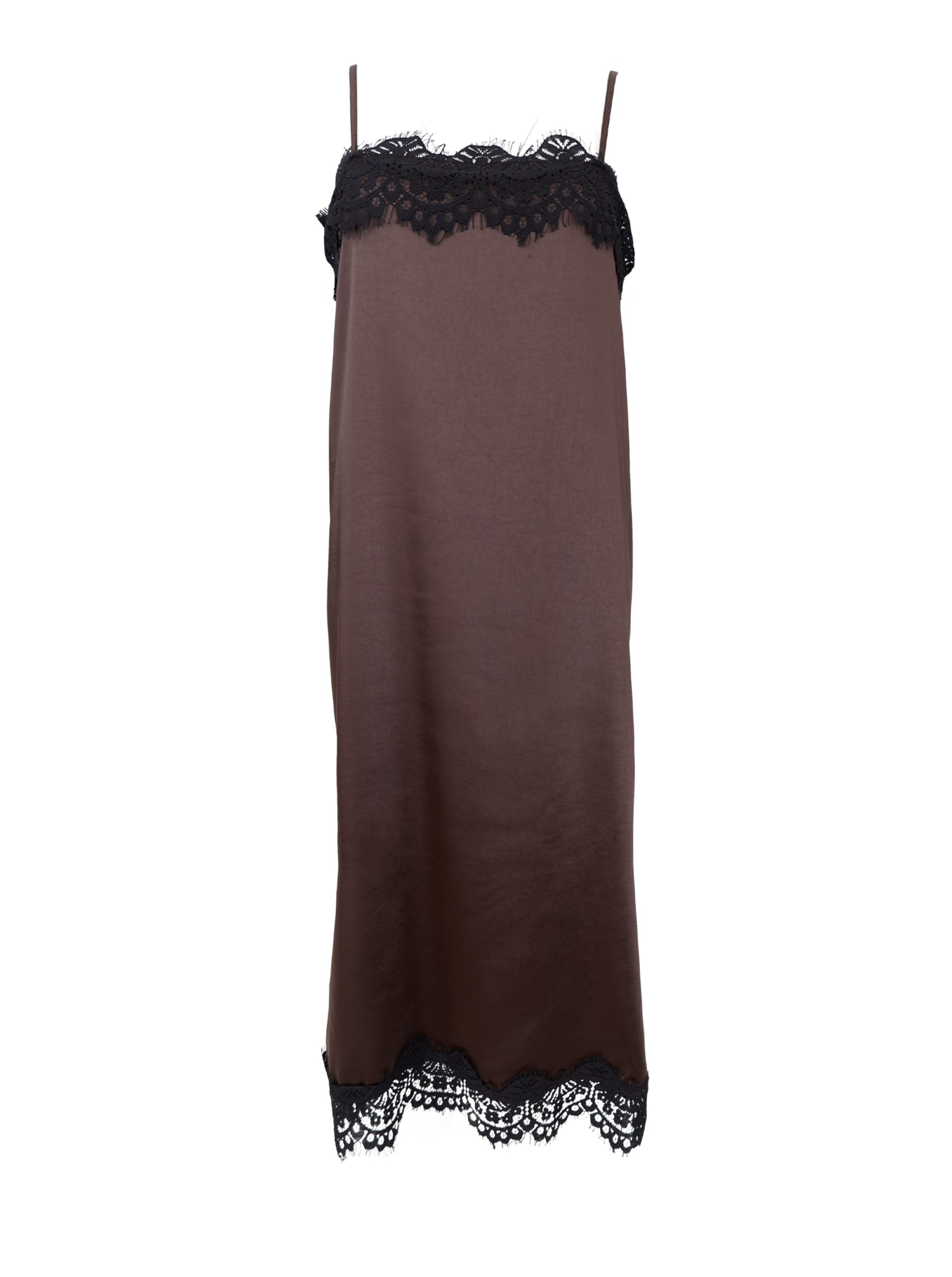 Elegantes Kleid mit dünnen Trägern und wunderschönen Spitzenborten an Ober- und Unterteil. Das Kleid hat eine schöne, gerade Passform, fällt fließend und verleiht einen eleganten Look. Der weiche, leicht glänzende Stoff sorgt für einen exklusiven Touch und macht das Kleid perfekt für festliche Anlässe und den Abend.