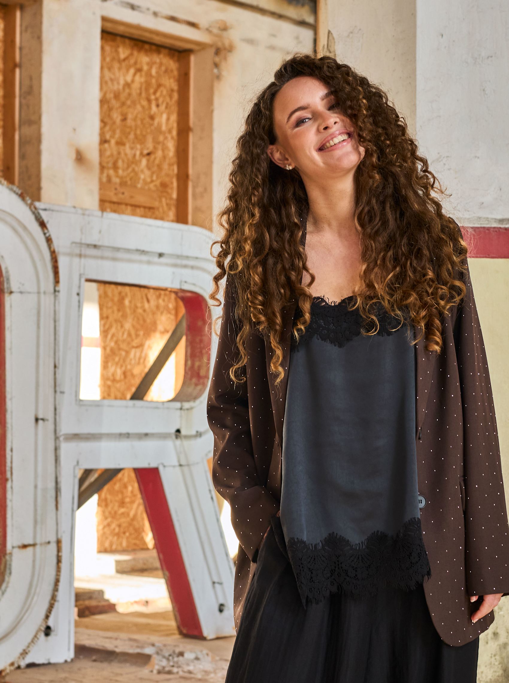Das Evie-Top ist ein wunderschönes Oberteil mit eleganten schwarzen Spitzenkanten. Es hat dünne Träger und einen lockeren Schnitt, der für eine leichte und schmeichelhafte Silhouette sorgt. Die feinen Spitzendetails an Ausschnitt und Saum verleihen ihm eine exklusive und romantische Note.