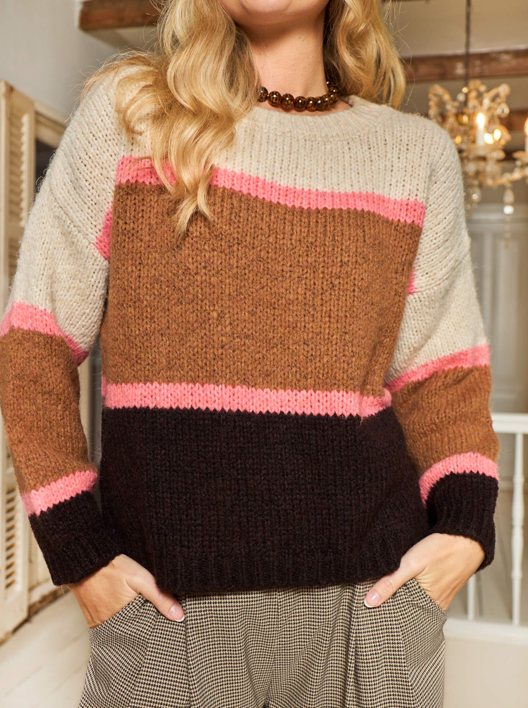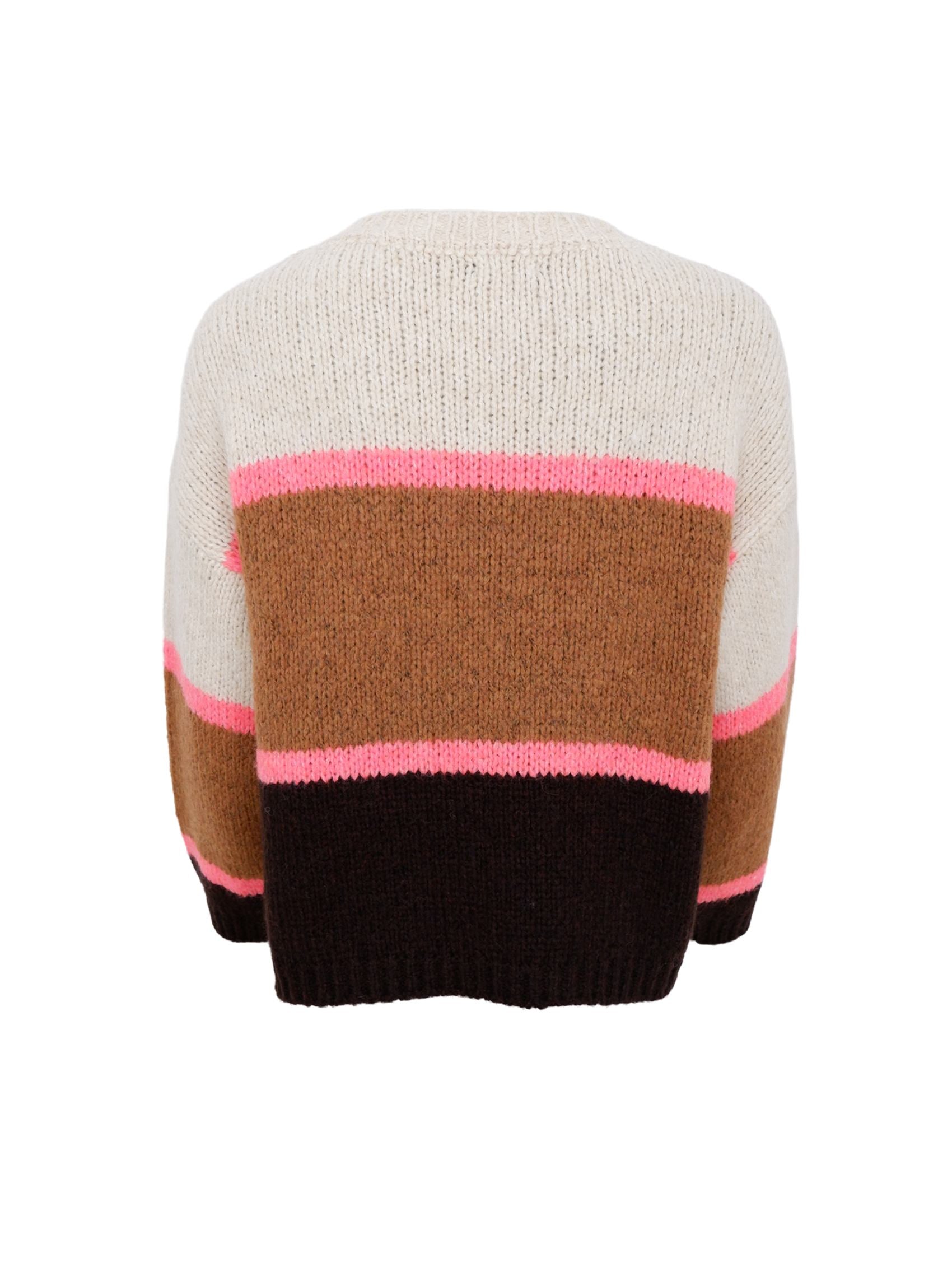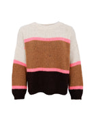 Dieser weiche und warme Strickpullover mit farbenfrohem Streifenmuster besticht durch seinen Rundhalsausschnitt, die langen Ärmel und die gerippten Bündchen, die für eine bequeme und lockere Passform sorgen. Die breiten Farbblöcke in Kombination mit den Neon-Details verleihen ihm einen modernen und frischen Look – perfekt für den Alltag und zum Kombinieren in der gesamten Saison.