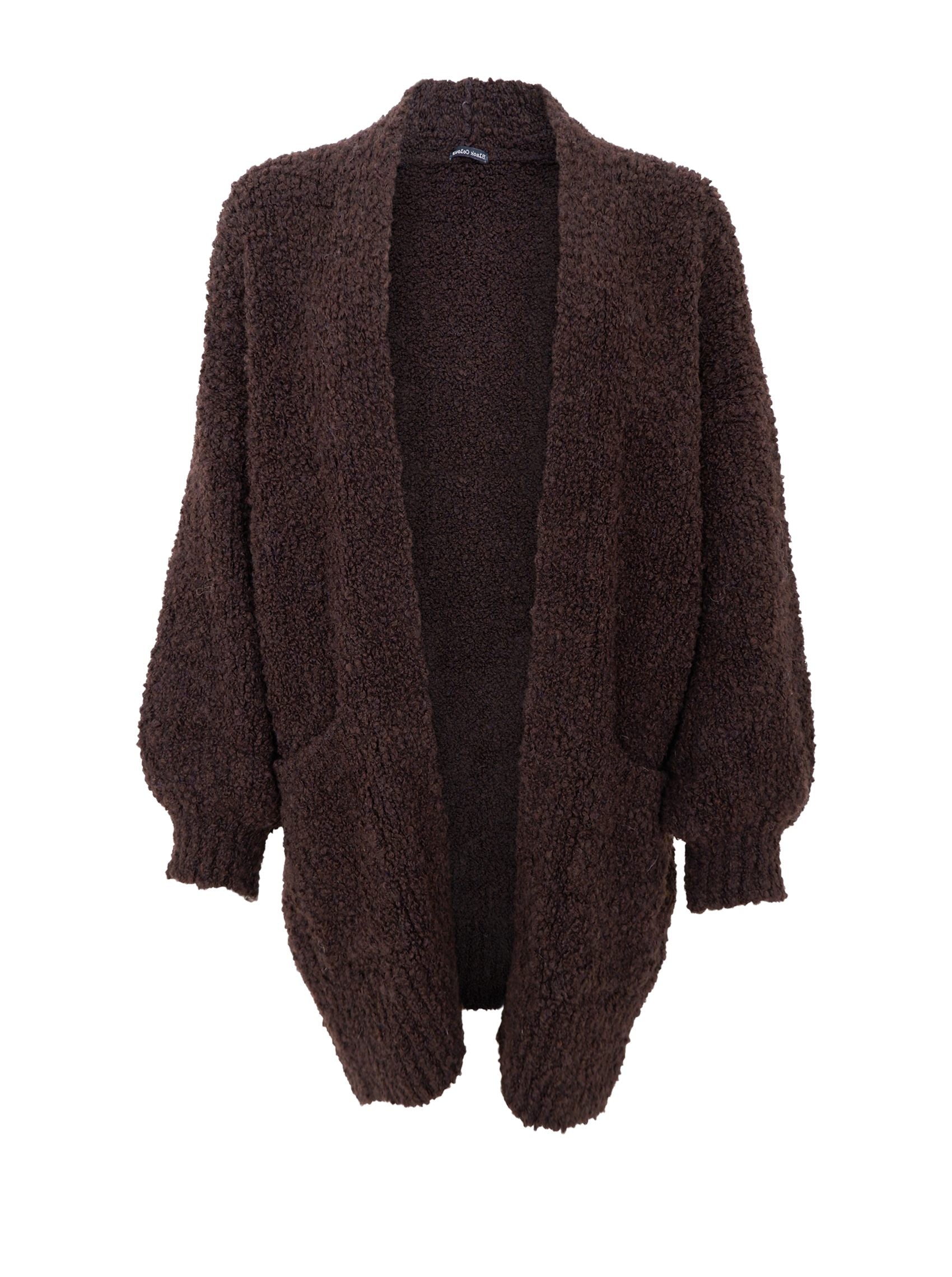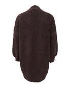 Weicher, flauschiger Cardigan in einem warmen Braunton. Der Cardigan hat eine lockere, offene Passform mit breiten Rippbündchen an den Ärmeln und großen, praktischen Taschen vorne. Die flauschige Textur sorgt für einen gemütlichen und entspannten Look – perfekt zum Drunterziehen an kühlen Tagen.