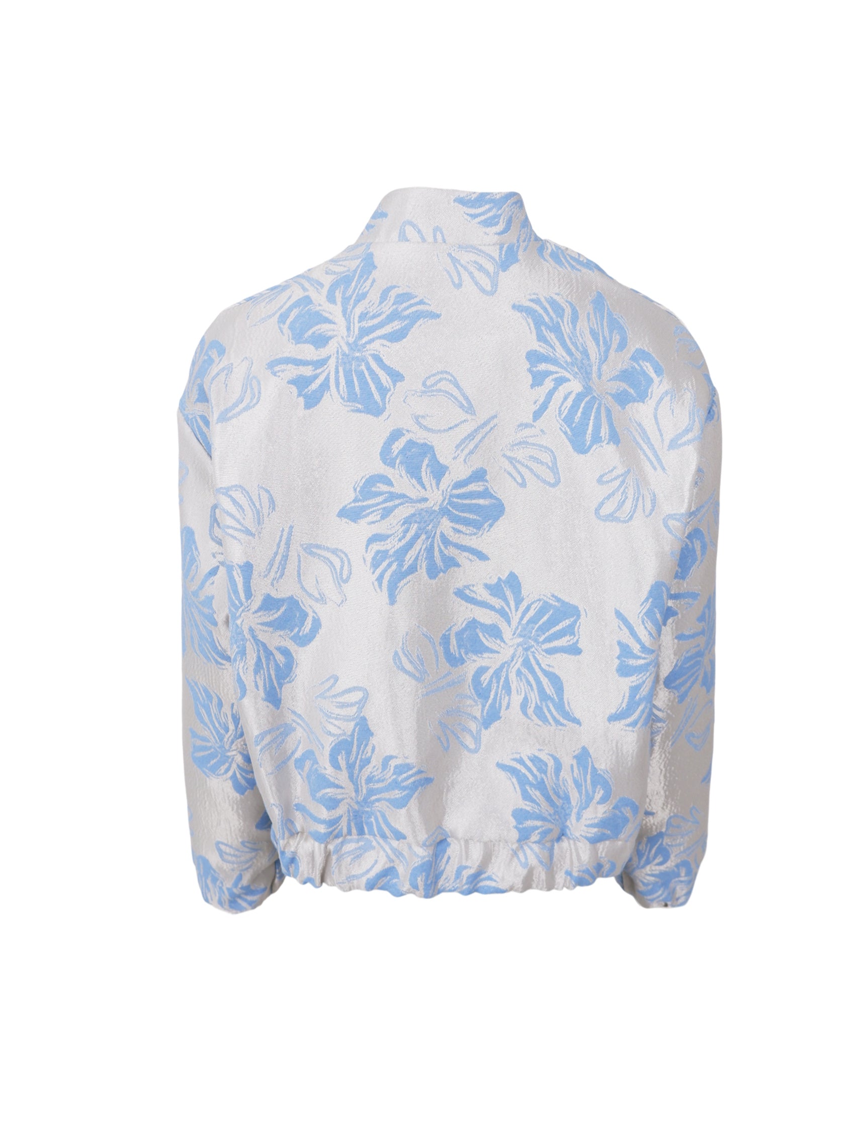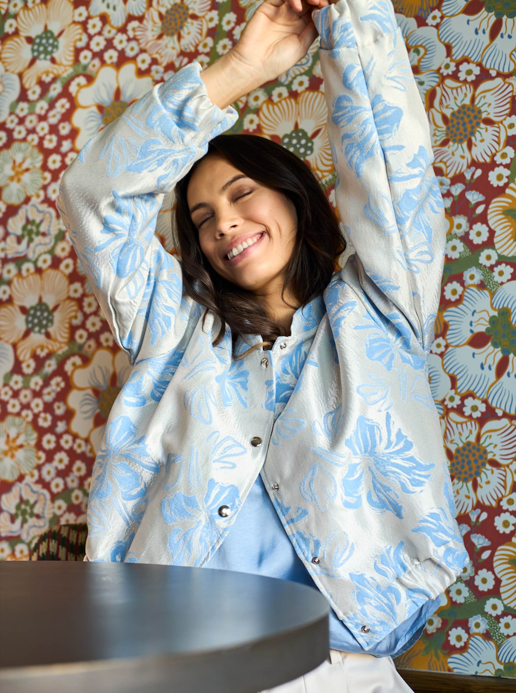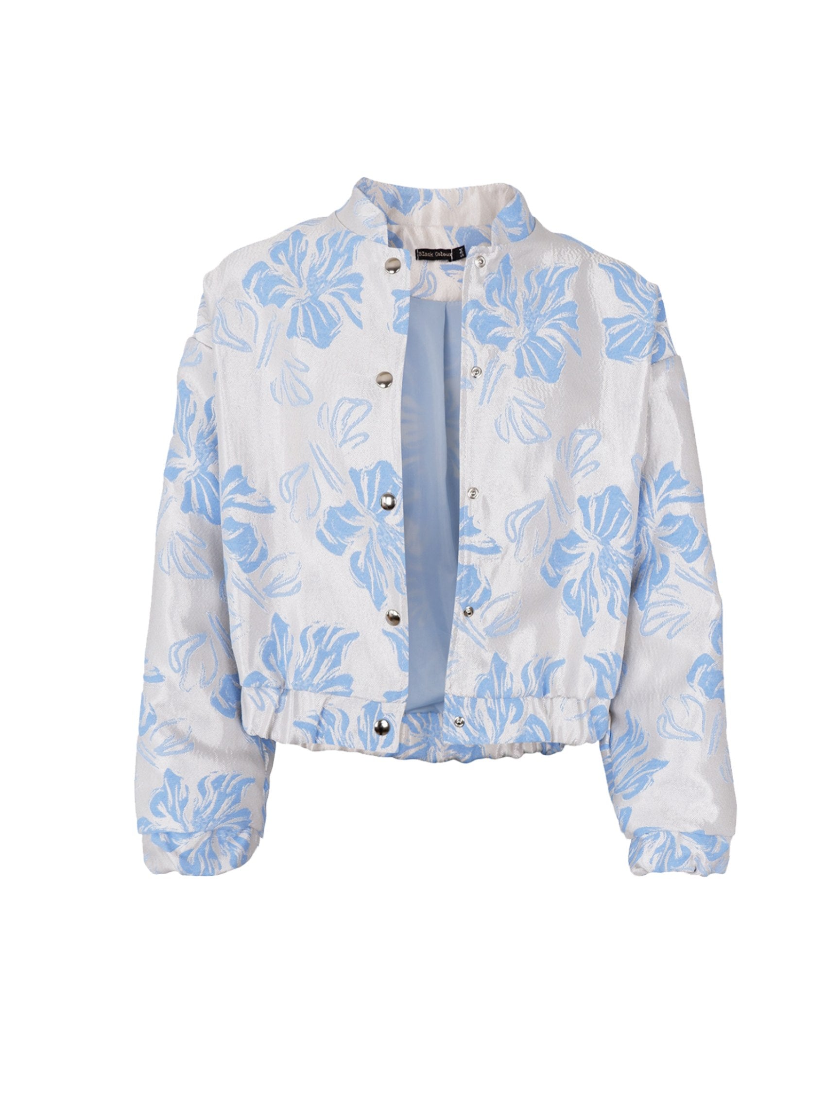 Leichte Frühlingsjacke in einer wunderschönen, strukturgewebten Qualität und einem glänzenden Blumenmuster, das einen exklusiven und stilvollen Look verleiht. Die kurze Länge und die leicht kastige Passform kreieren eine trendige Silhouette, die sich leicht sowohl für den Alltag als auch für elegantere Anlässe stylen lässt.