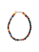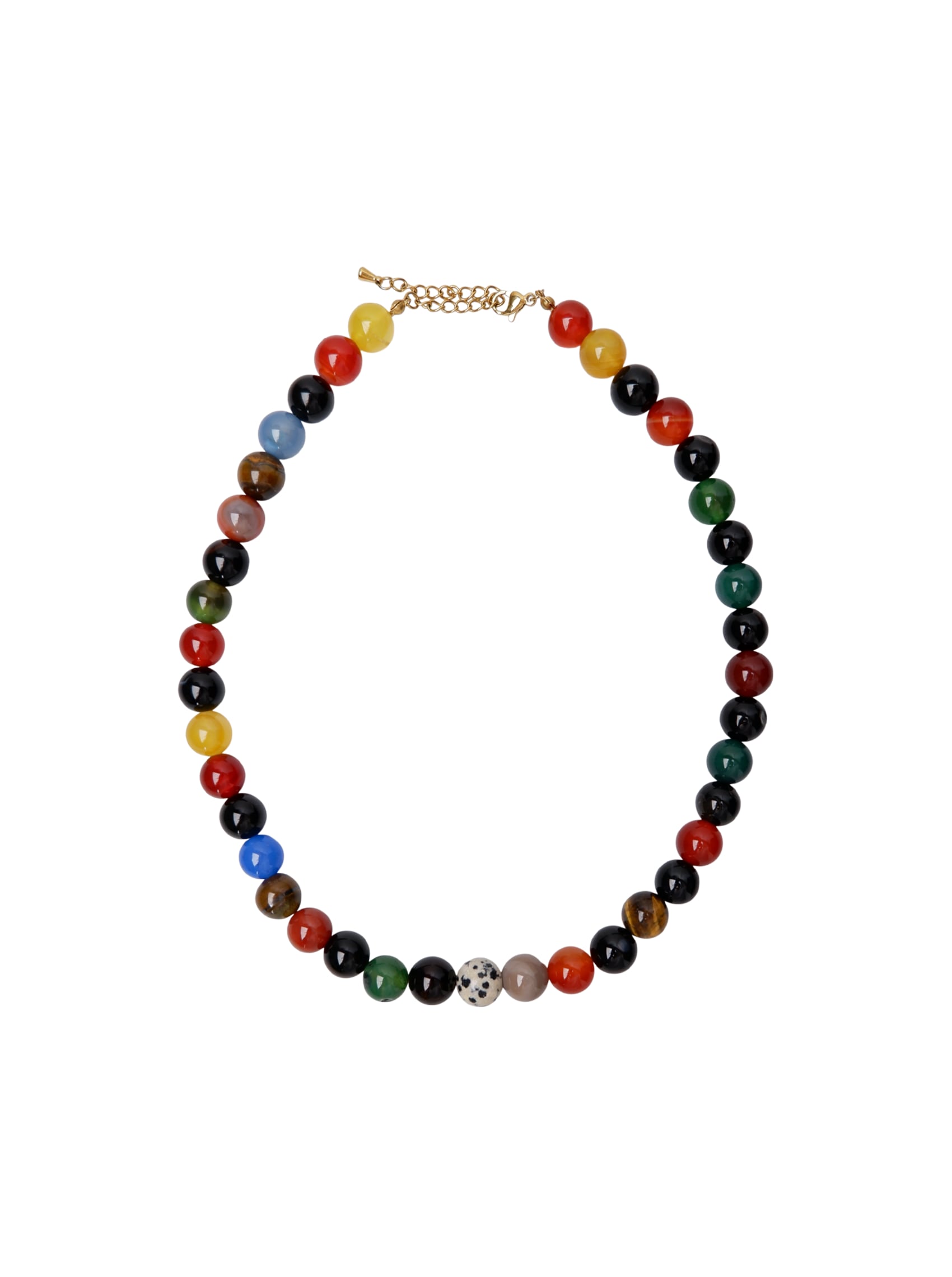 Die Jade-Halskette ist eine farbenfrohe Perlenkette mit runden Steinperlen in vielen schönen Farbtönen. Die Halskette hat einen verstellbaren Verschluss aus goldfarbenem Metall und sorgt für einen verspielten und auffälligen Look, der sowohl allein als auch in Kombination mit anderem Schmuck getragen werden kann.