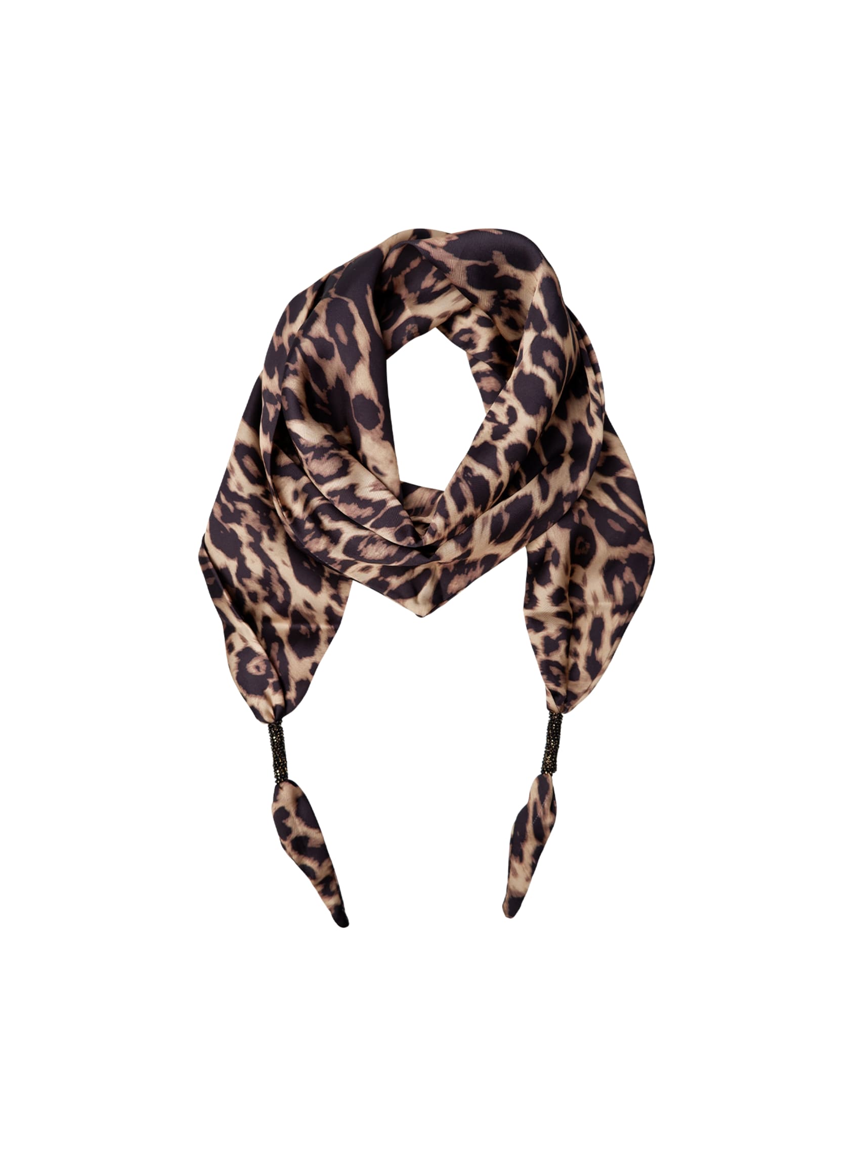 Wunderschöner, doppellagiger Minischal im Leopardenmuster mit glitzernden Details an den Enden der Bänder.