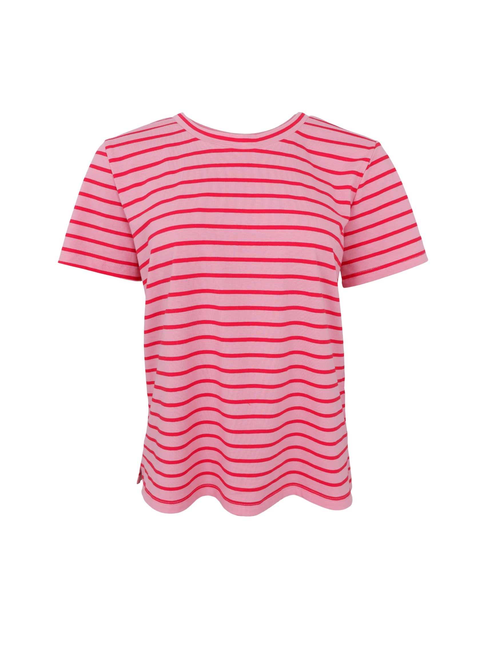 Dieses wunderschöne und vielseitige Streifenshirt bringt Schwung und Freude in Ihre Garderobe. Der klassische Rundhalsausschnitt und die kurzen Ärmel sorgen für einen lässigen und praktischen Look. Die leichte und bequeme Passform mit schmeichelhafter Silhouette macht es ideal für Jeans, Röcke und Shorts.