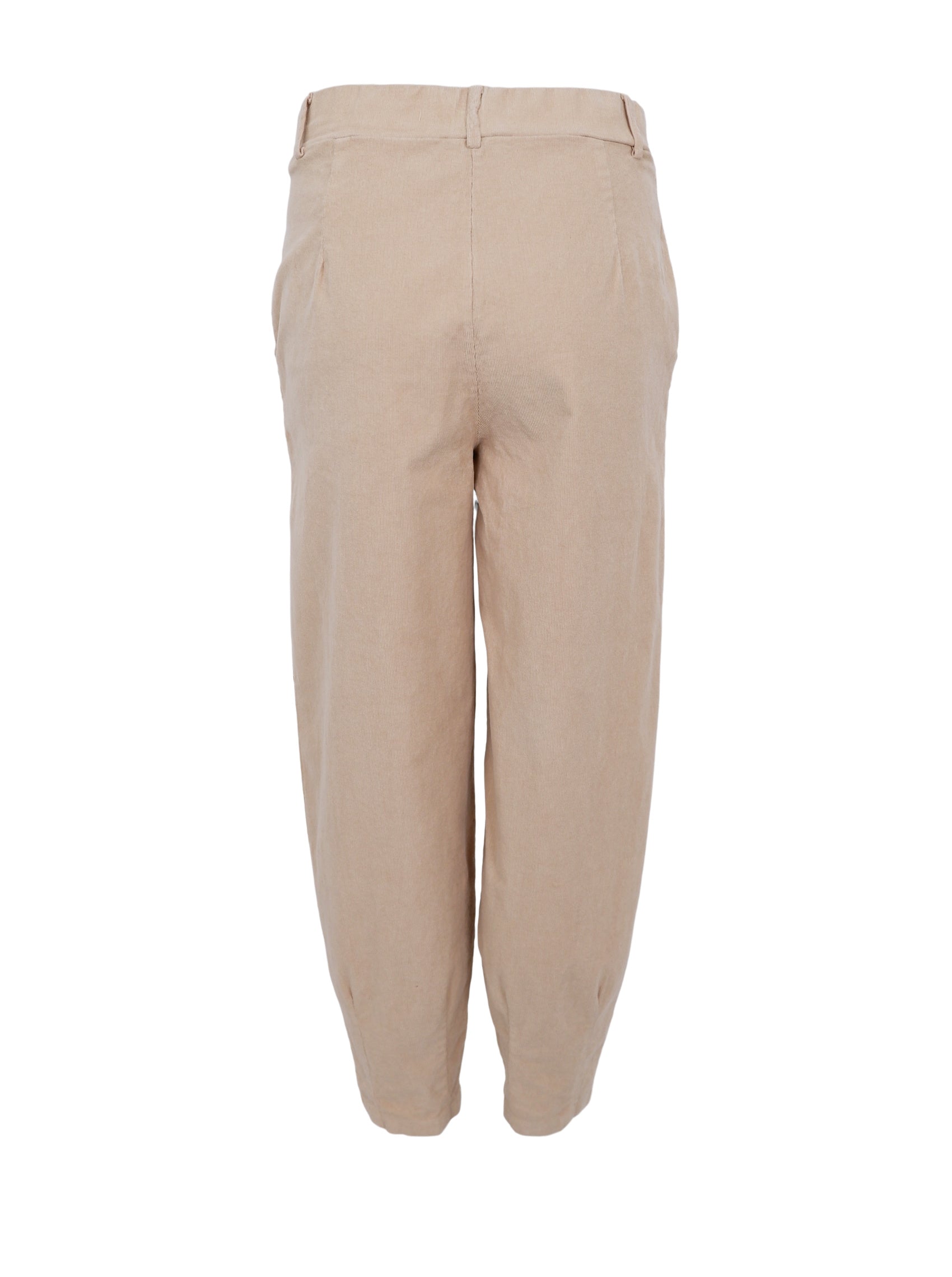 Coolste Barrel-Hose aus weichem Babycord mit entspannter Passform. Das Modell hat einen elastischen Bund hinten, Gürtelschlaufen, Seitentaschen und ein leicht abgerundetes Bein, das für einen modernen und bequemen Look sorgt.