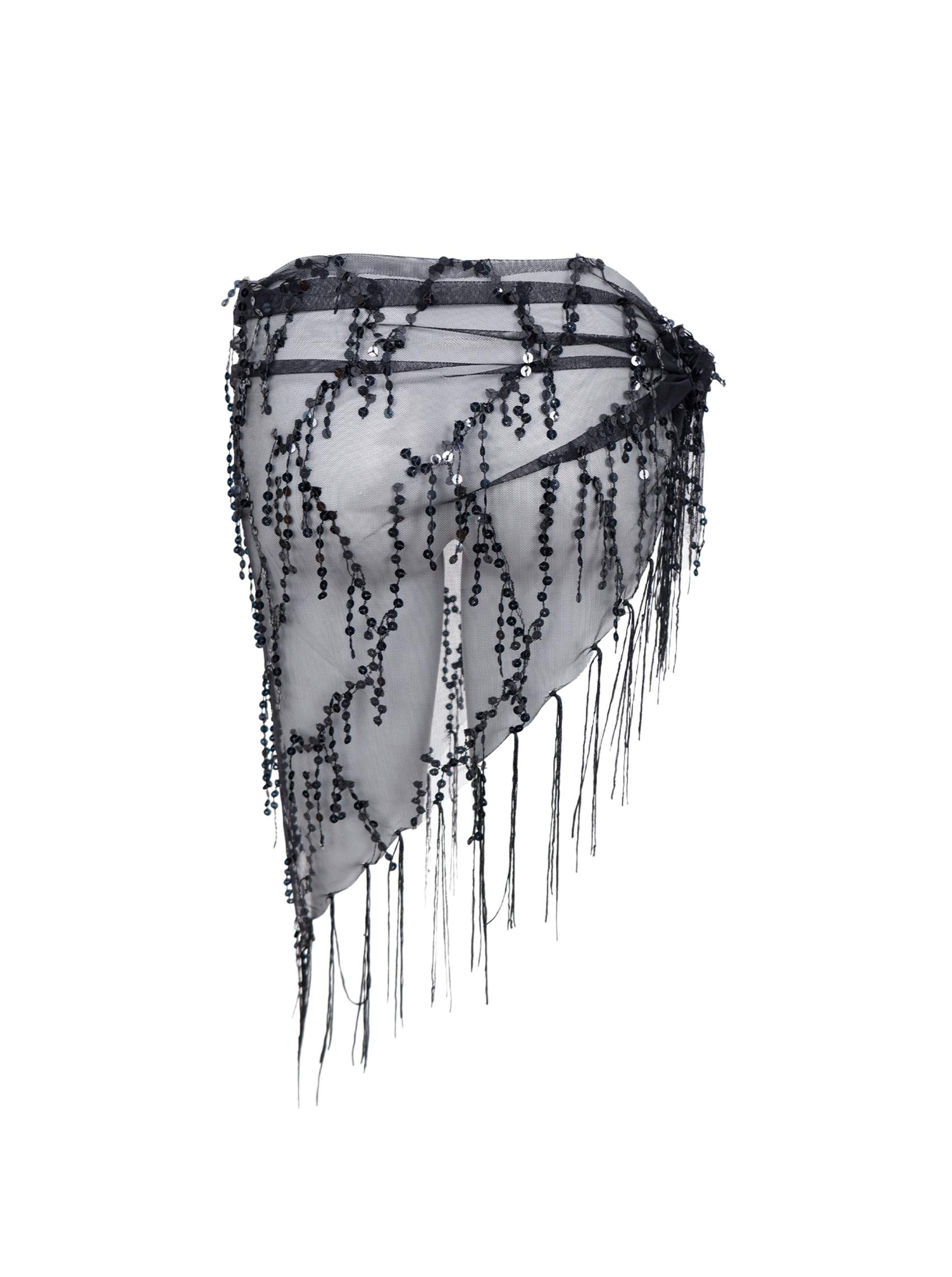 Verleihen Sie Ihrem Outfit mit diesem wunderschönen Schal eine festliche und exklusive Note. Er ist aus leichtem, transparentem Material gefertigt und mit glitzernden Pailletten verziert, die in langen, fließenden Fransen herabfallen und so für einen effektvollen Look sorgen. Dank seiner dreieckigen Form lässt er sich vielseitig stylen – ob um die Hüfte, als Schultertuch oder als eleganter Schal. Perfekt für festliche Anlässe oder wenn Sie ein schlichtes Outfit mit einem besonderen Accessoire aufwerten möchten.