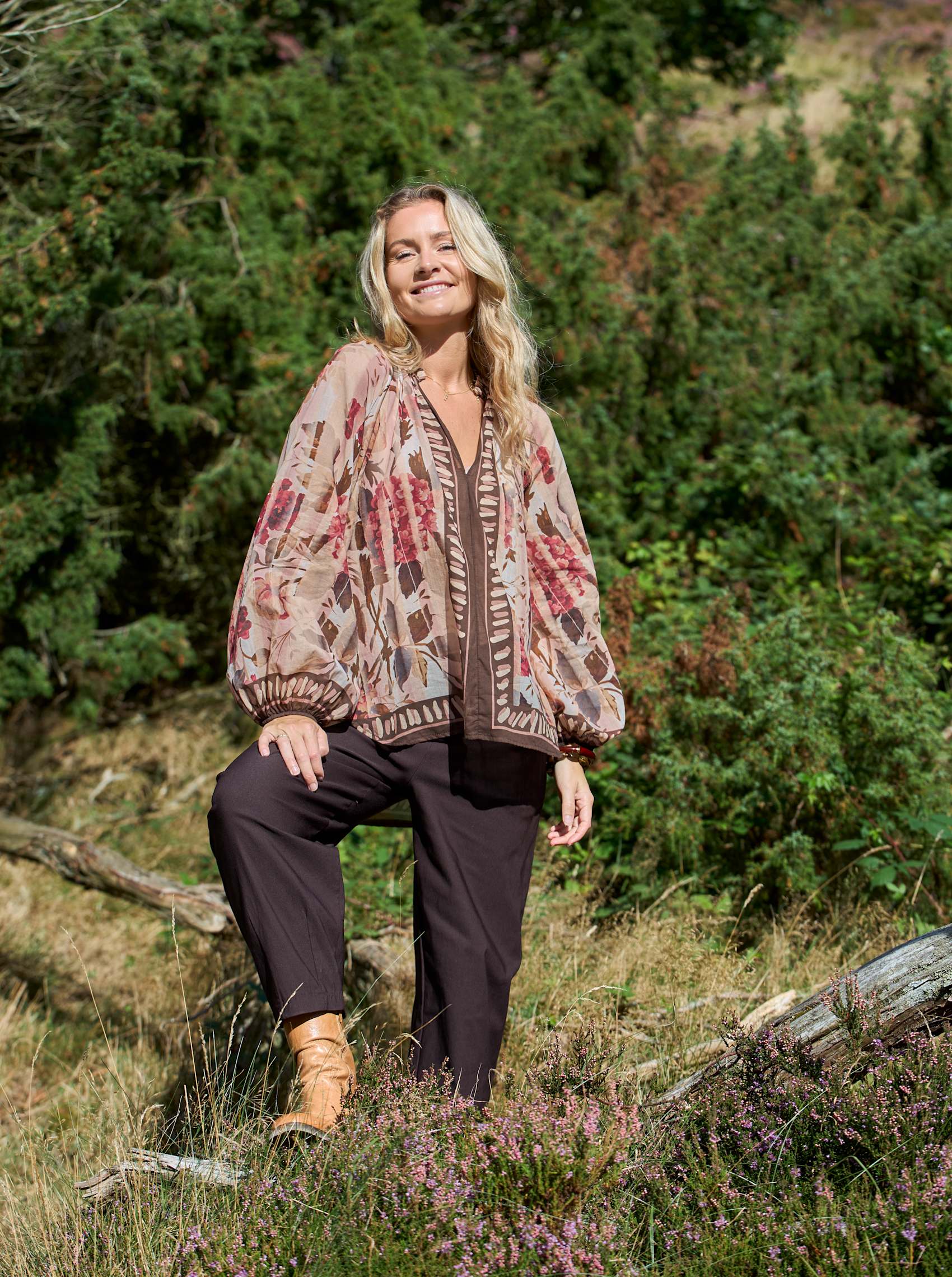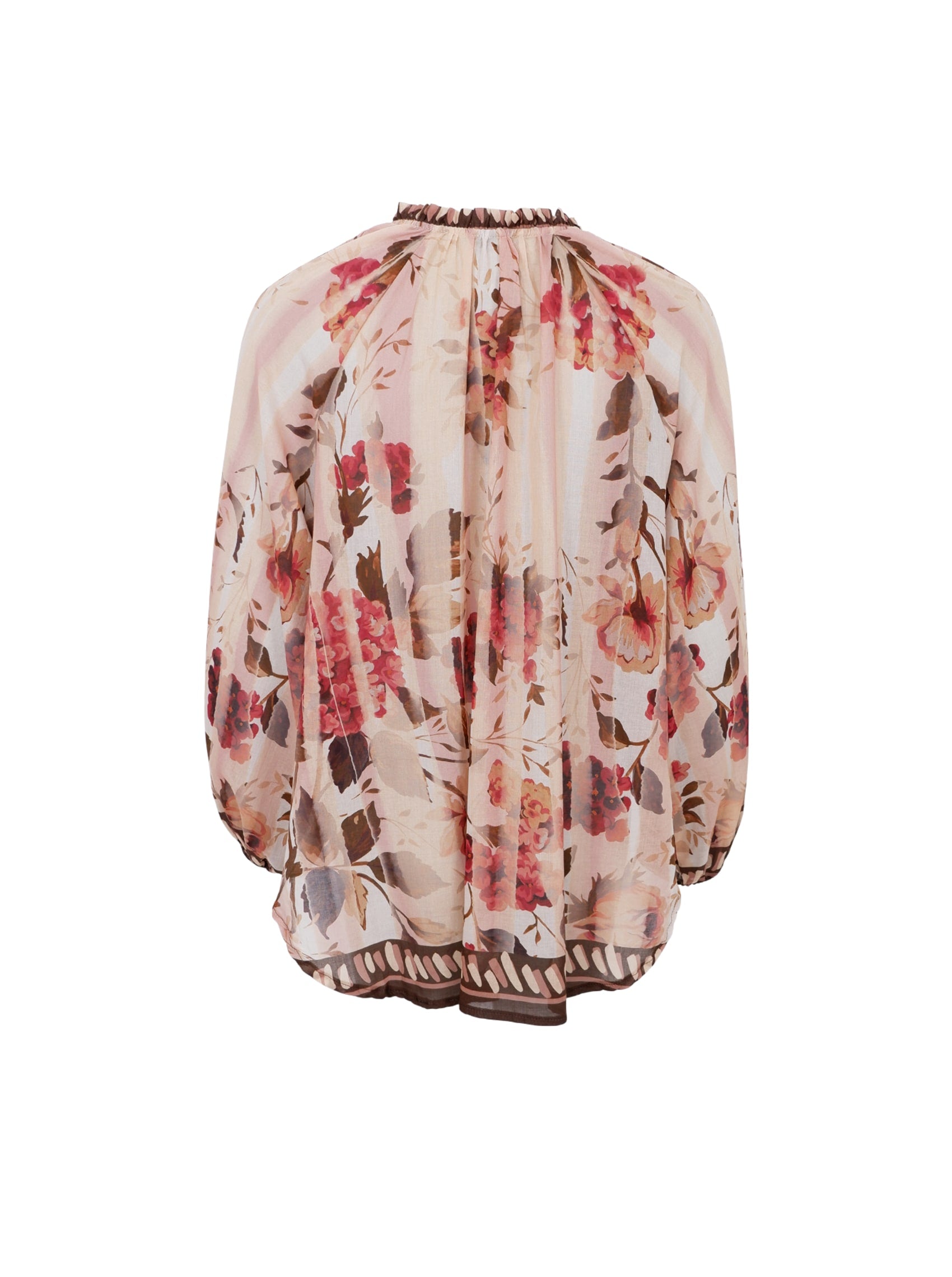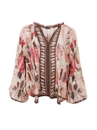 Leichte und luftige Baumwollbluse mit lockerer Passform, schönem Druck und weiten, fließenden Ärmeln. Die Bluse hat einen V-Ausschnitt mit dekorativen Banddetails am Rand, die ihr einen femininen und eleganten Look verleihen.
