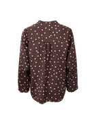 Bluse mit Punkten in klassischem und femininem Design. Die Bluse hat lange Ärmel und einen V-Ausschnitt mit kleinem Kragendetail, was ihr einen entspannten, aber eleganten Look verleiht.