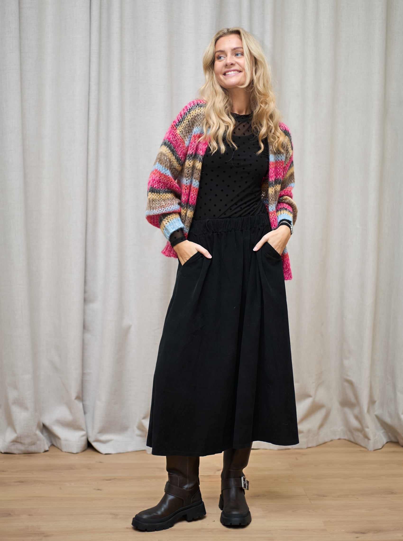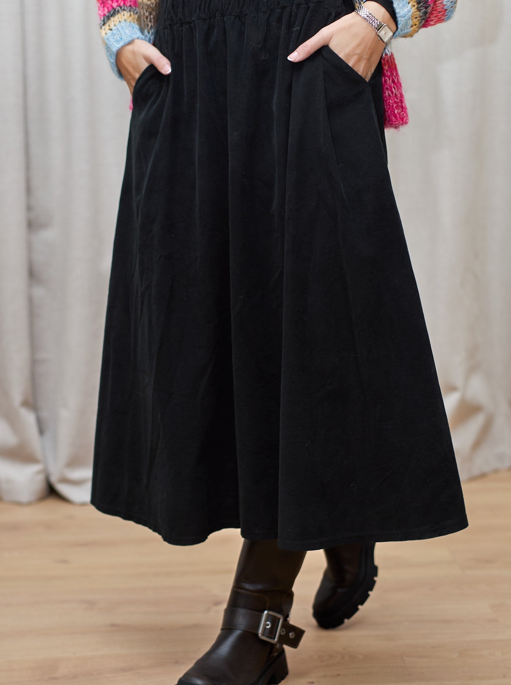 Weicher und bequemer Rock aus Baby-Samt mit schöner, lockerer Passform. Der Rock fällt wunderschön und hat einen elastischen Bund, der für hohen Tragekomfort sorgt und ihn vielseitig kombinierbar macht – sowohl im Alltag als auch im Büro.